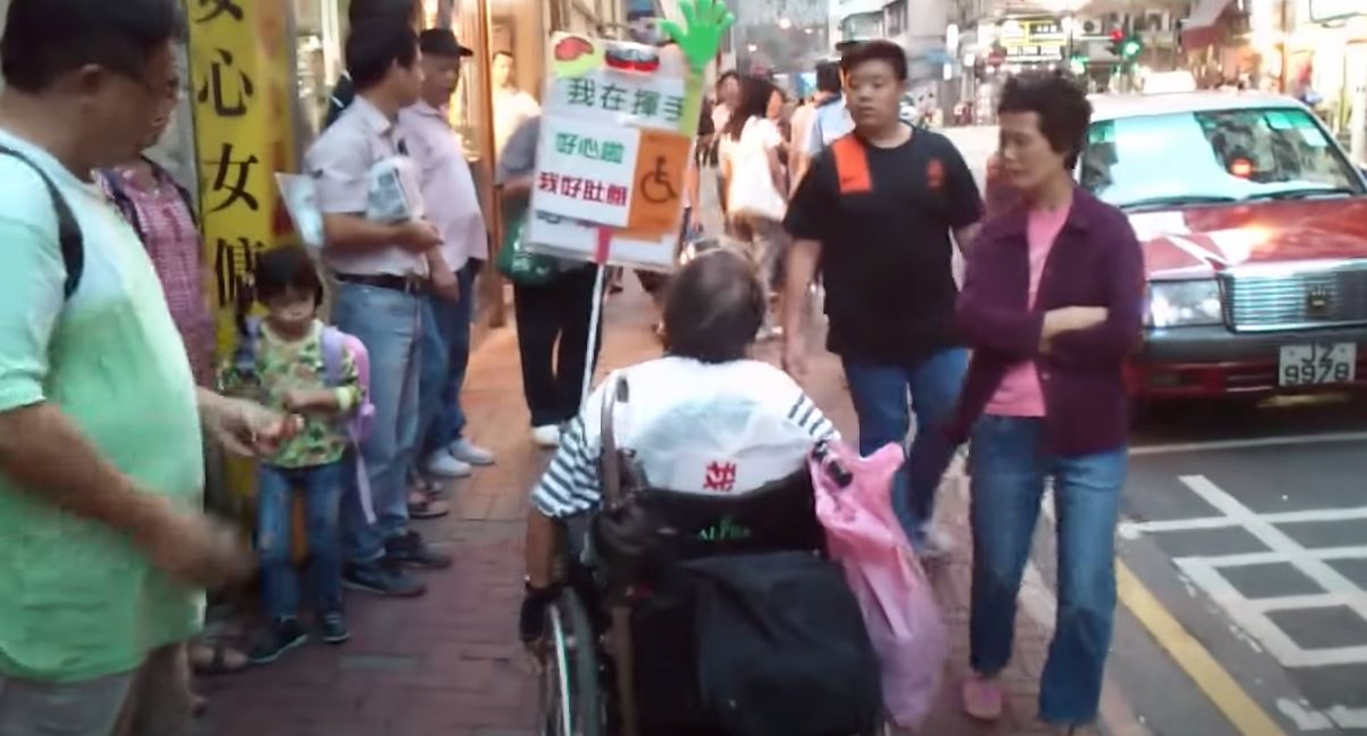 9 A6 E( @. e$ F7 |7 atvb now,tvbnow,bttvb「安蔭婆婆」離開的士車廂坐上輪椅,其輪椅上插上一個寫有「我在揮手」、「請前來吧」和「我想坐車」的字句,而且印有一個輪椅人士圖案,字牌背後寫上「我好肚餓」。(網上影片截圖)