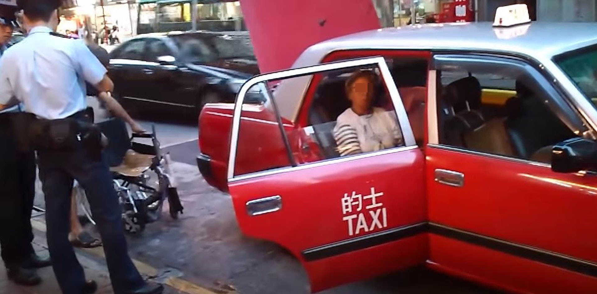 相中老婦在沙田橫壆街2號廣寧大廈對開離開的士車廂,並且手持手推車,在場則有兩名警員,上載者表示現場有人形容老婦「已幾次坐霸王車㗎喇」,但對方態度囂張。(Chi Keung Tang/facebook群組「沙田之友」圖片)