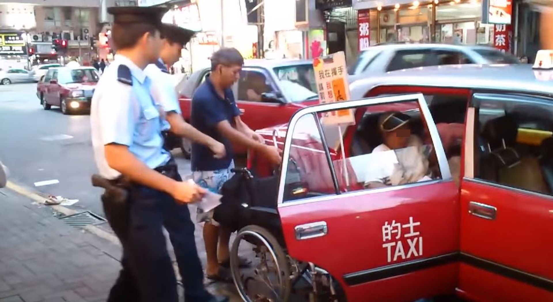 「安蔭婆婆」離開的士車廂坐上輪椅,其輪椅上插上一個寫有「我在揮手」、「請前來吧」和「我想坐車」的字句,而且印有一個輪椅人士圖案,字牌背後寫上「我好肚餓」。(網上影片截圖)公仔箱論壇, F- n' B2 r3 V/ o