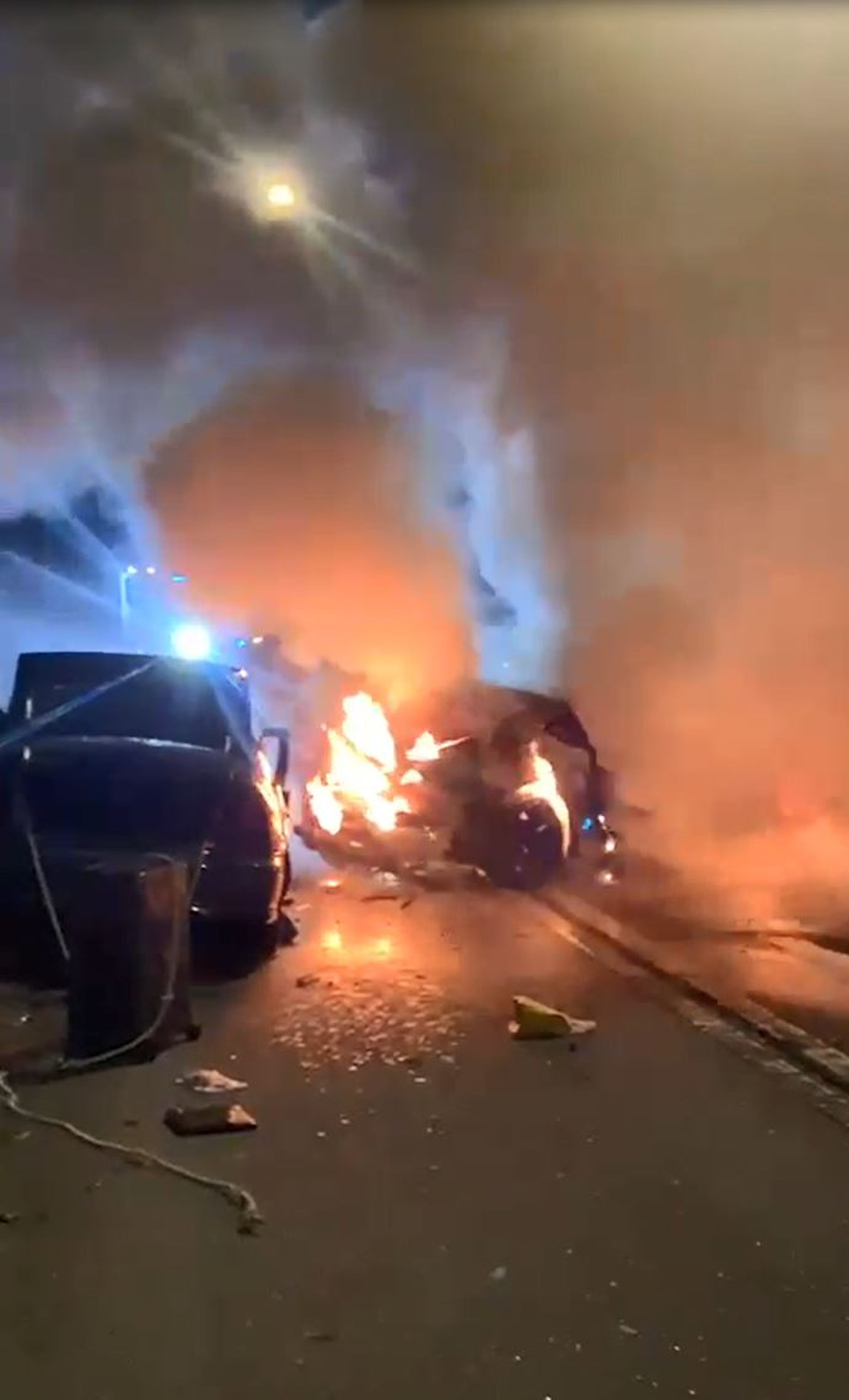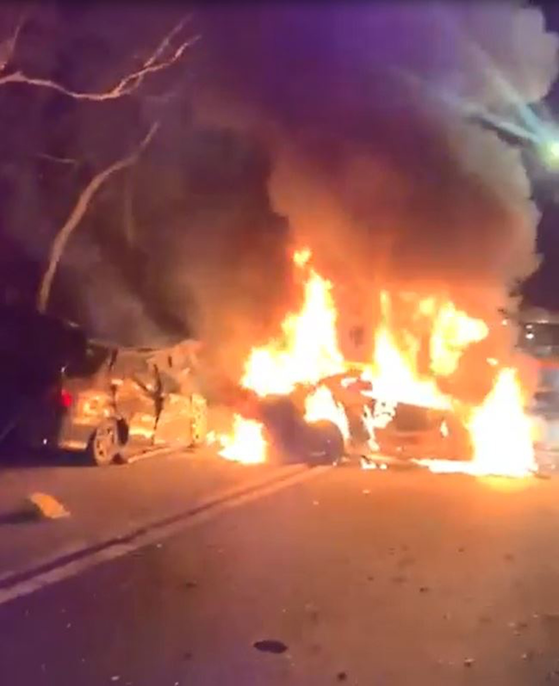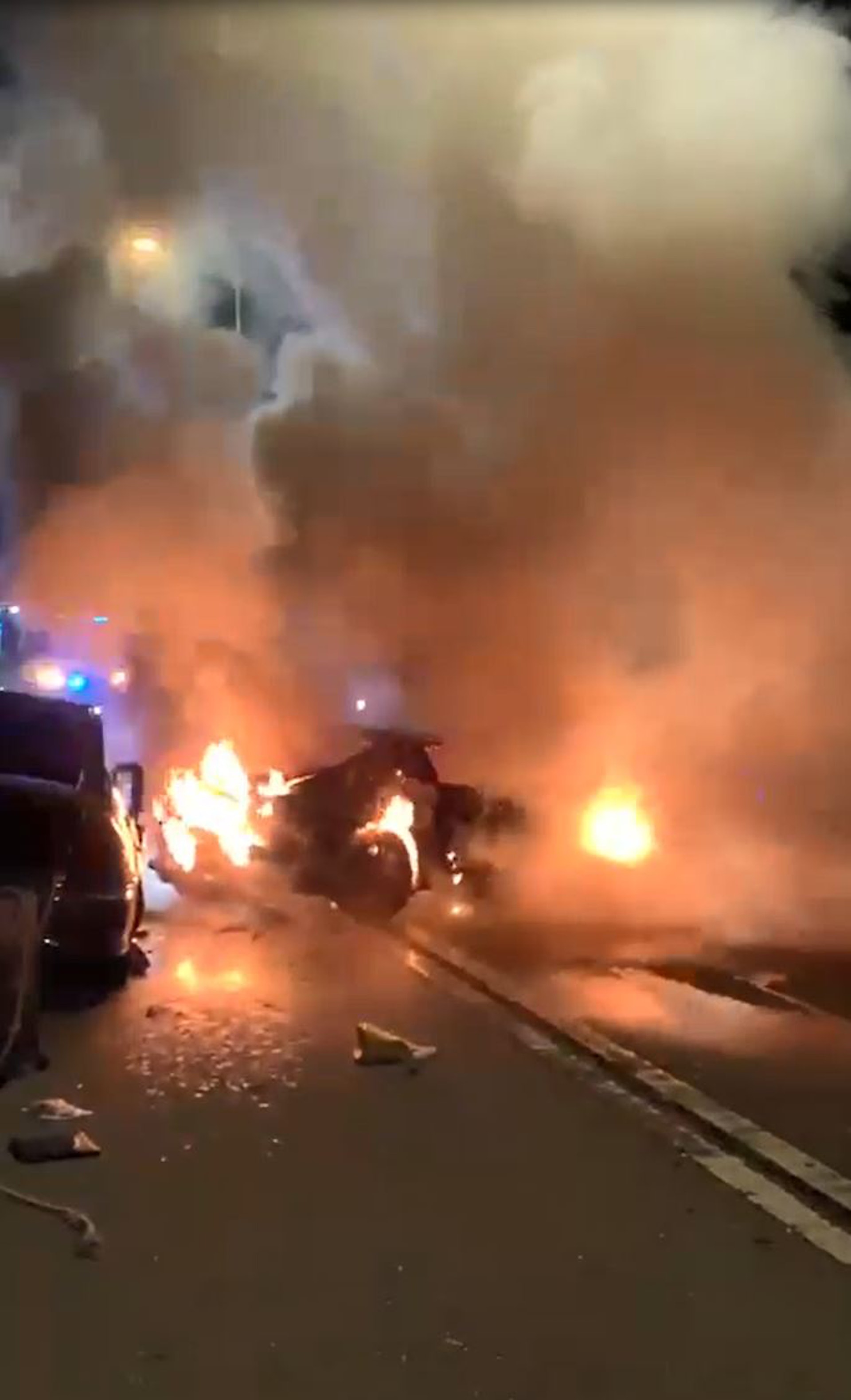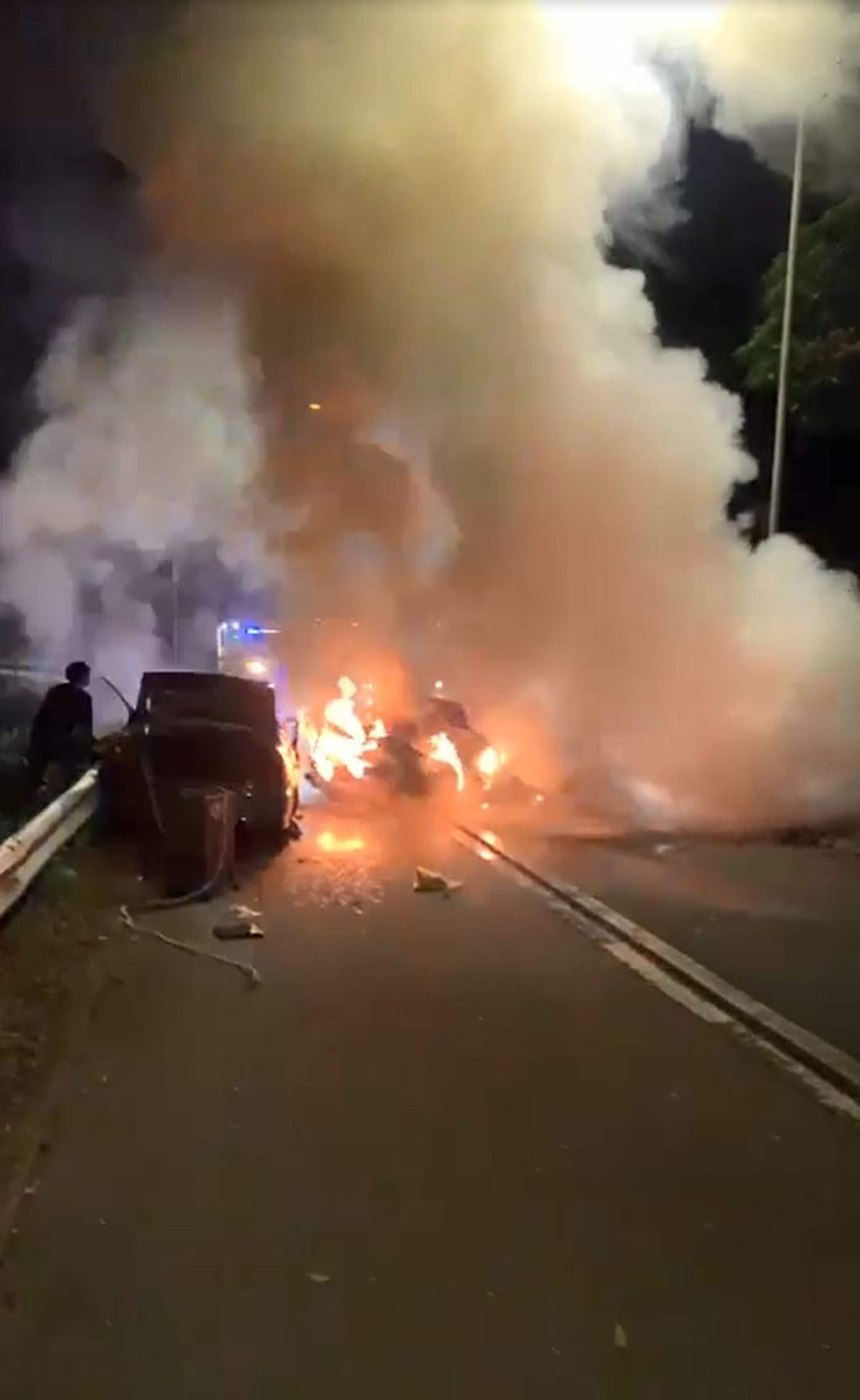 $ ]/ V- v- X0 J5 j o$ }公仔箱論壇車禍後有私家車陷入火海。(網上影片截圖); S; `8 b; R5 c* l