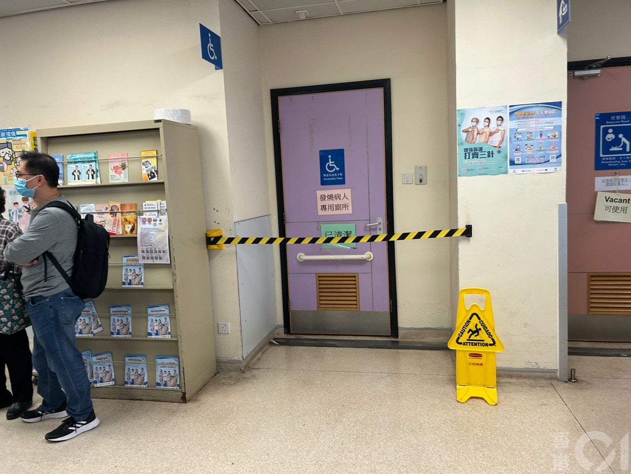 一名58歲女病人4月17日倒斃東區醫院急症室無障礙廁所(俗稱殘廁)。4月18日早上所見,死者倒斃的殘廁就在等候區。(鄧康翹攝)7 B9 A- @* X% c& v# Y; n. ^, K