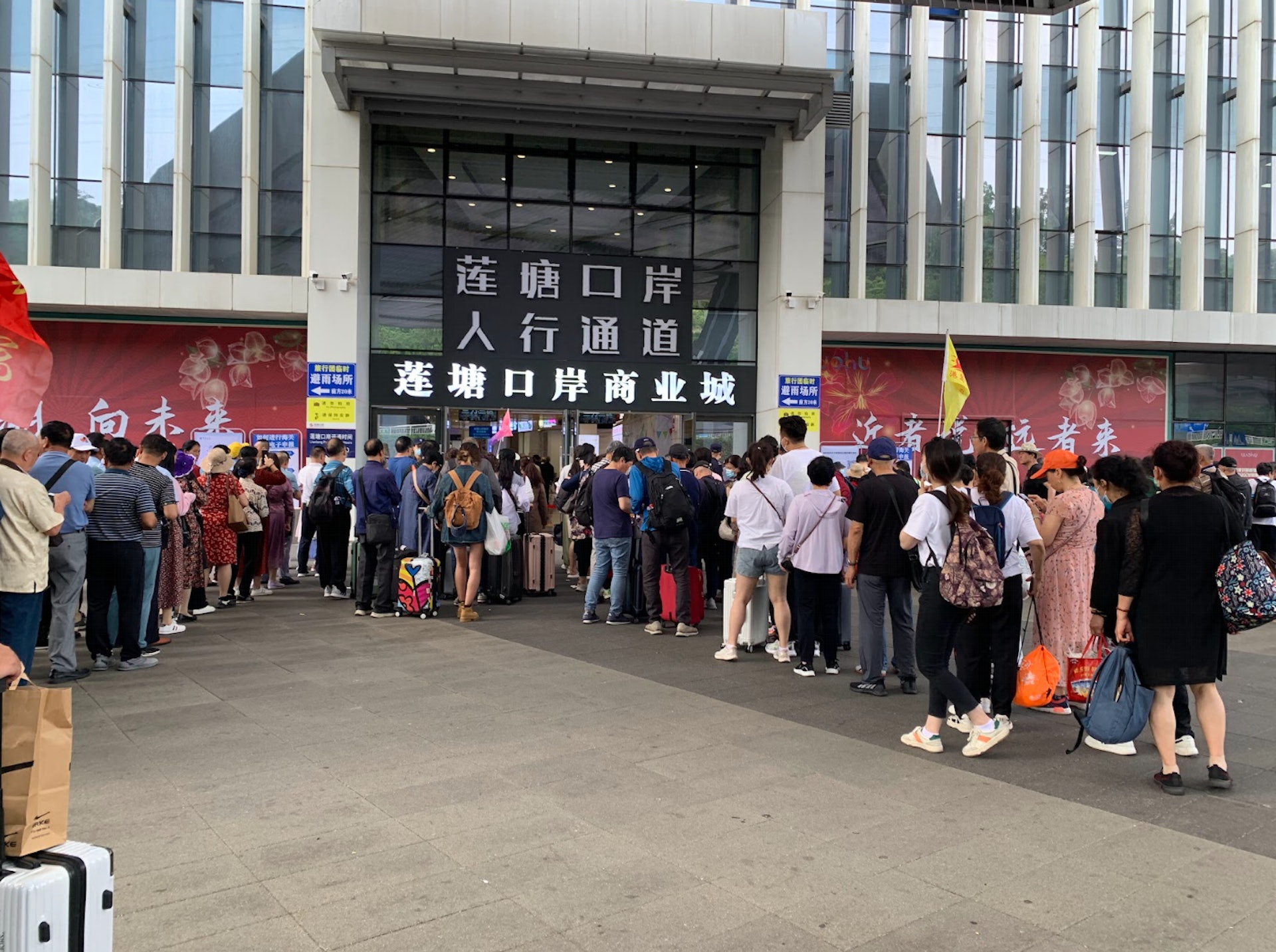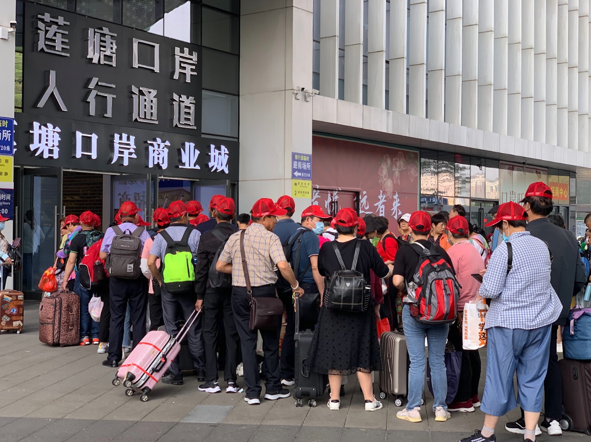 蓮塘口岸擠滿各種旅行團,有戴紅帽的旅行團排隊進入口岸。(林芷瑩攝)+ u& w; S3 p( G0 ?" S$ k9 `+ _