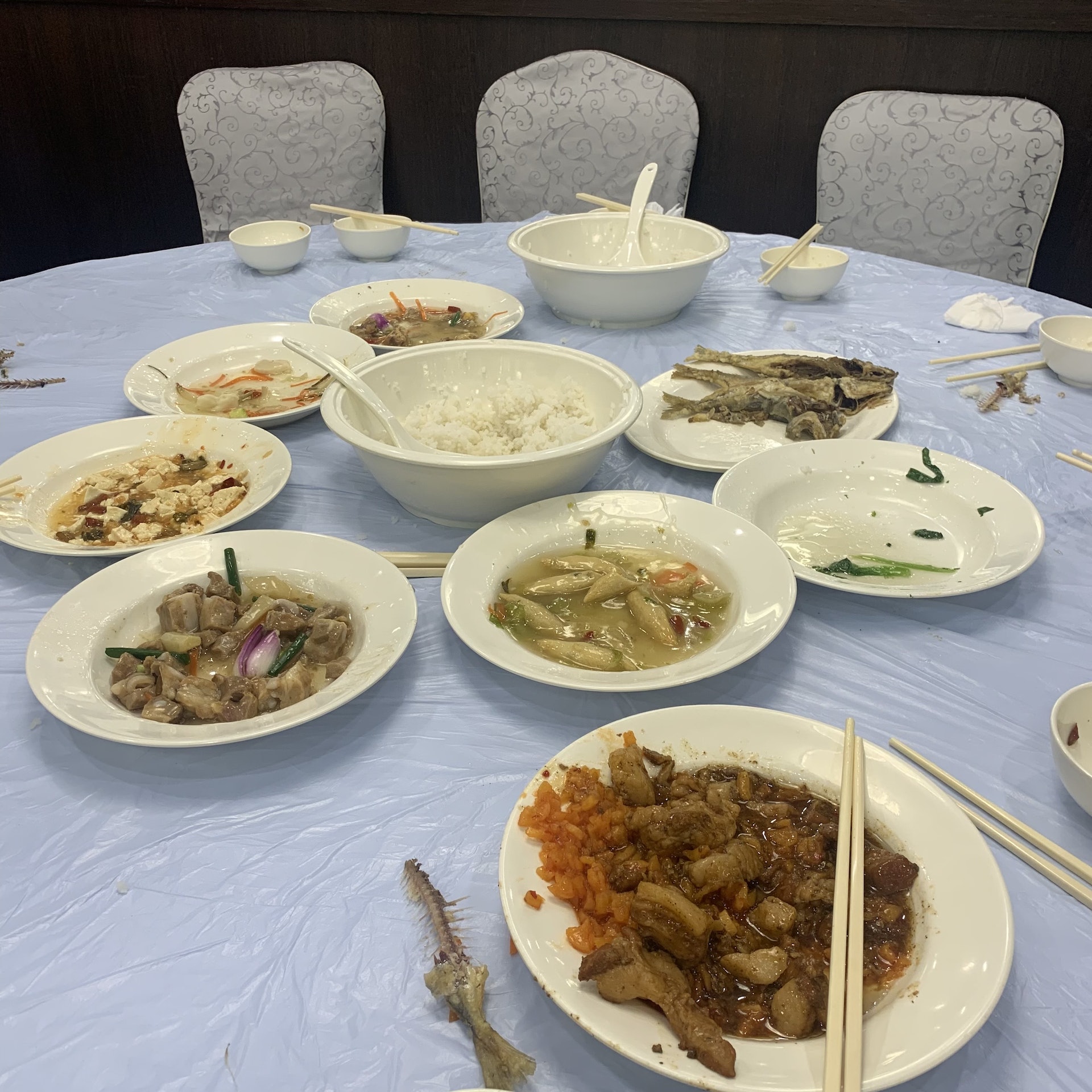 9 g" g( L- Q- L+ E, a3 j1 L# }用餐不到15分鐘,與記者一同用餐的同桌團員都已離席,但剩菜仍很多。(香港01記者攝)