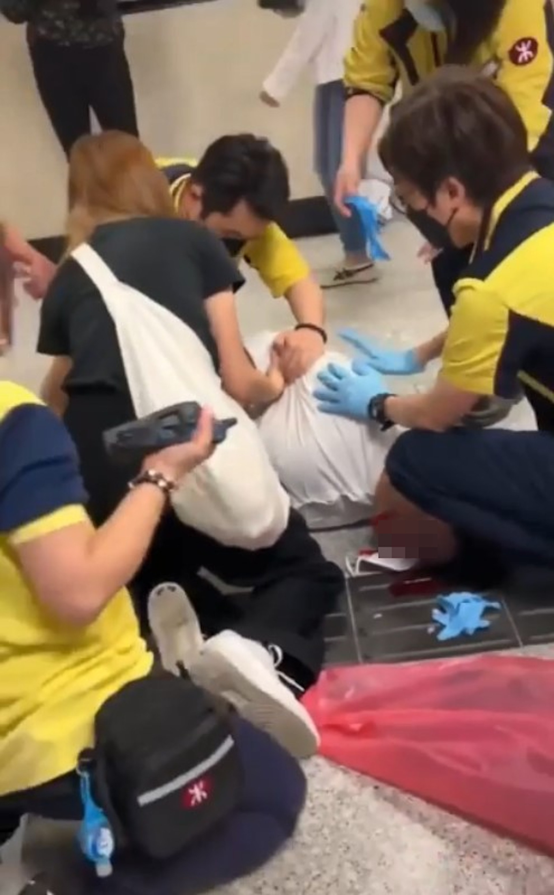 片段拍攝到一名身穿白恤衫、深色長牌及波鞋的男事主趴在地上,身旁有一束以紅色膠袋裝着的花。兩名女子在旁分別輕拍其身體嘗試叫醒他,一人示意其他人協助通知車站職員。其後陸續有港鐵職員到場,亦有男乘客協助報警,職員則與另一名女子合力把男事主轉身,女子並以剪刀剪開事主的上衣,之後與職員輪流為事主進行心外壓急救,亦有職員拿出自動體外心臟去顫器(AED),並為事主貼上電極片。當時事主滿面鮮血,雙眼閉上,嘴巴微微張開,地上亦留有血跡。有旁觀市民則叫事主「醒呀!」