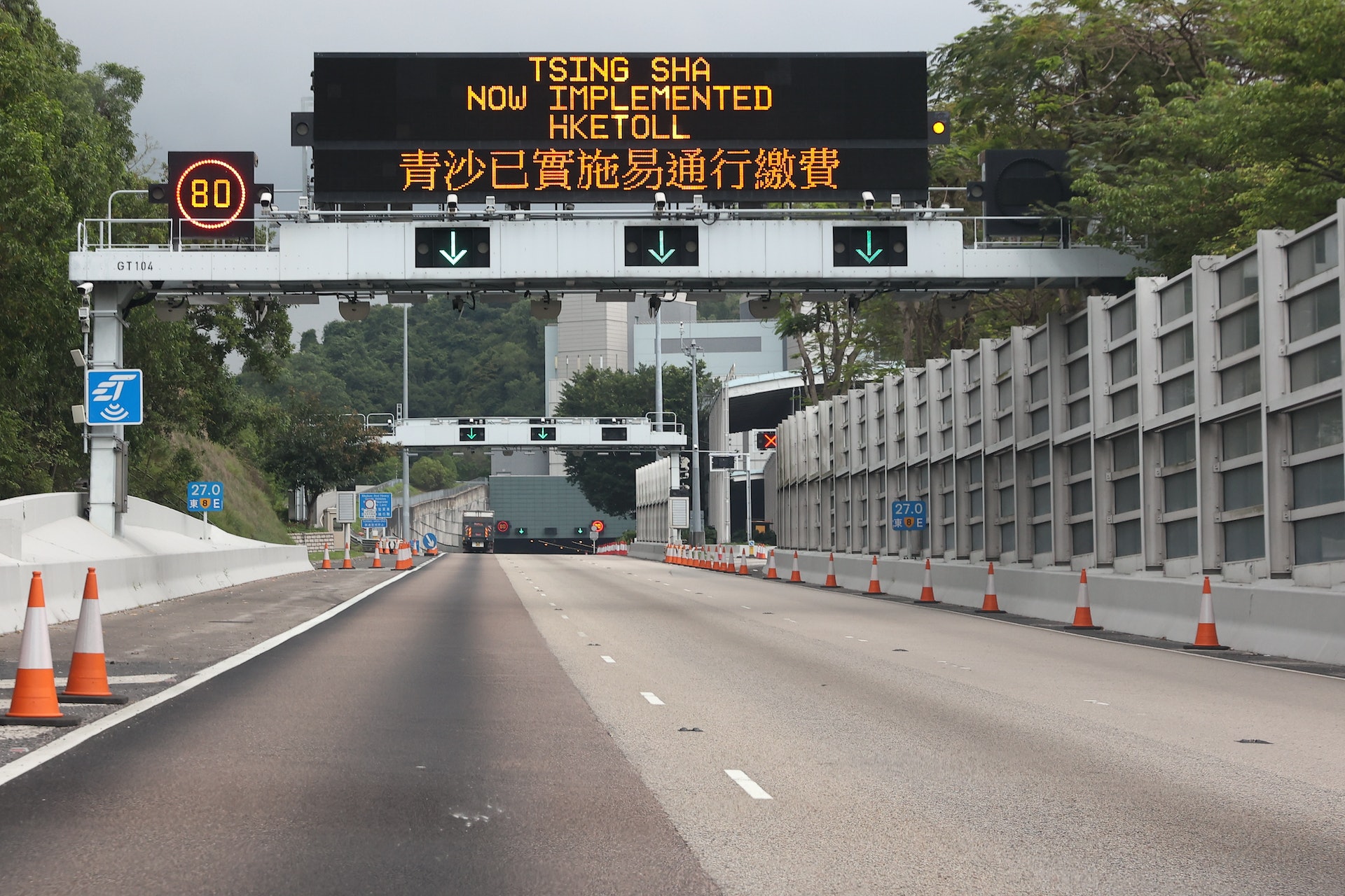 不停車繳費「易通行」5月7日於青沙管制區率先實施,隧道外行車線重新整理,以「雪糕筒」圍封大部份線道。 (張浩維攝): Y& d2 B8 @3 p' G* d+ S