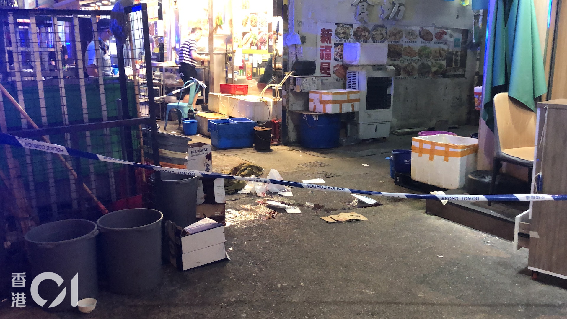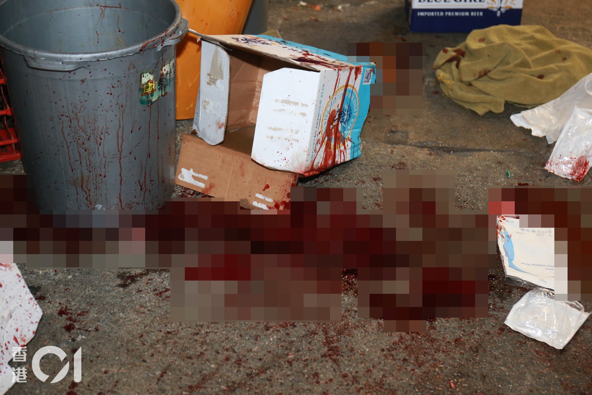 事主捱斬後倒地現場地面遺下大灘血迹,一些放在路邊的紙箱等雜物亦染血。(林振華攝)公仔箱論壇% B3 X& \6 k' W" l2 |# g; g