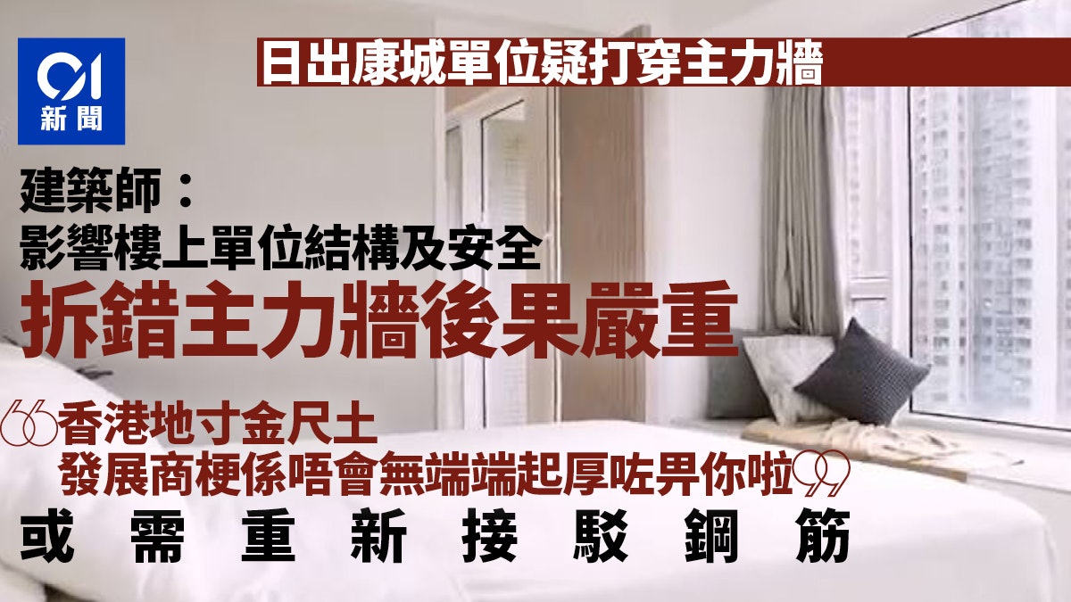 該建築師昨日向《香港01》表示,如果涉及改動主力牆的工程,必須要入則向屋宇署申請,除了視乎改動位置及範圍,亦要符合樓契、窗台數目有否違反《建築物條例》等要求,「就算要打,政府都唔會畀你咁容易做」。而進行相關工程亦應由專業合資格人士包括結構工程師作評估。- V: J9 ]) R$ X+ l1 ]2 j9 ~5 @