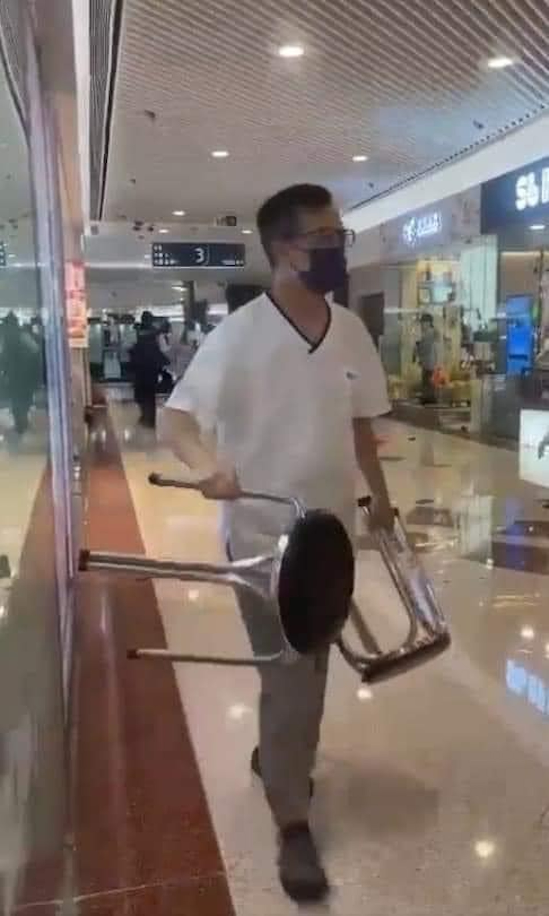 7 f7 B8 `5 h4 V: ?& X4 u; @公仔箱論壇警員抵達及制服疑兇後,身穿白色廚房工作服的男子手持兩張圓凳離開。(網上影片截圖)os.tvboxnow.com: j9 {* _# |6 p' f1 i/ r8 D