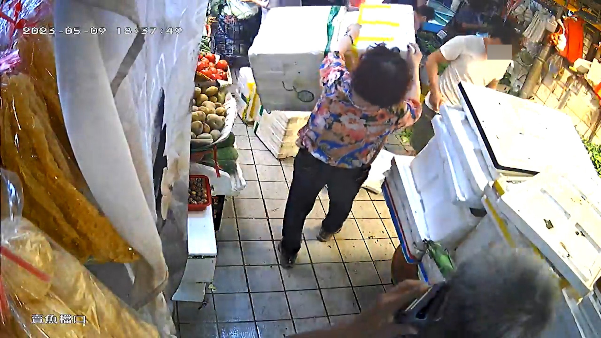 ) U3 n o( h6 iTVBNOW 含有熱門話題,最新最快電視,軟體,遊戲,電影,動漫及日常生活及興趣交流等資訊。大嬸掉落箱蓋,砸中買菜大叔的腳。(fb群組「香港突發事故報料區及討論區」影片截圖)
