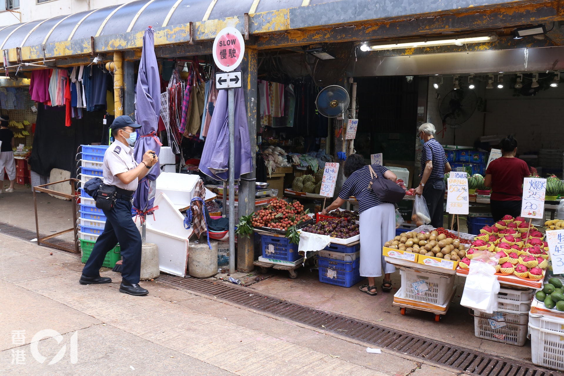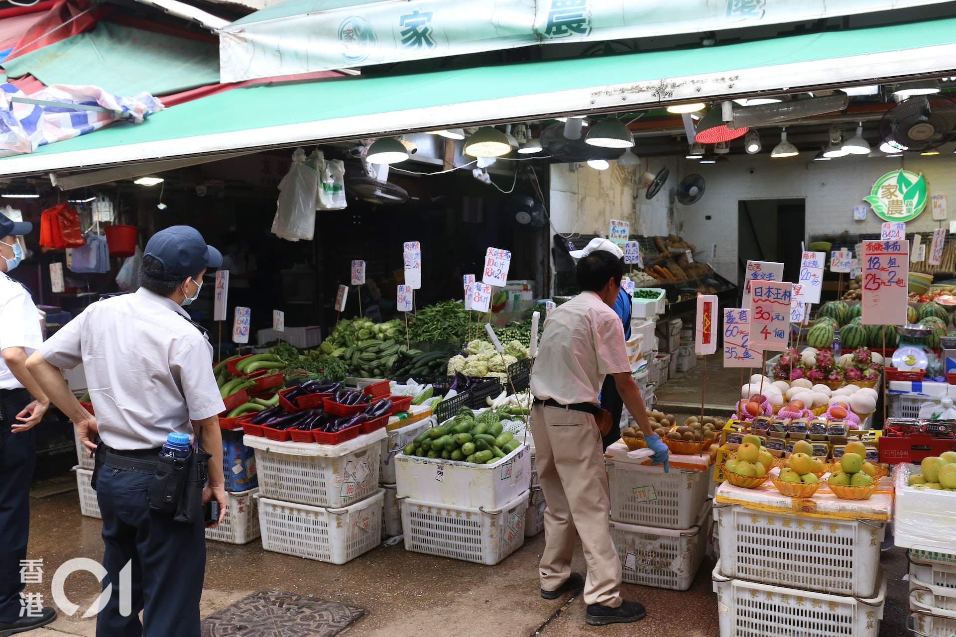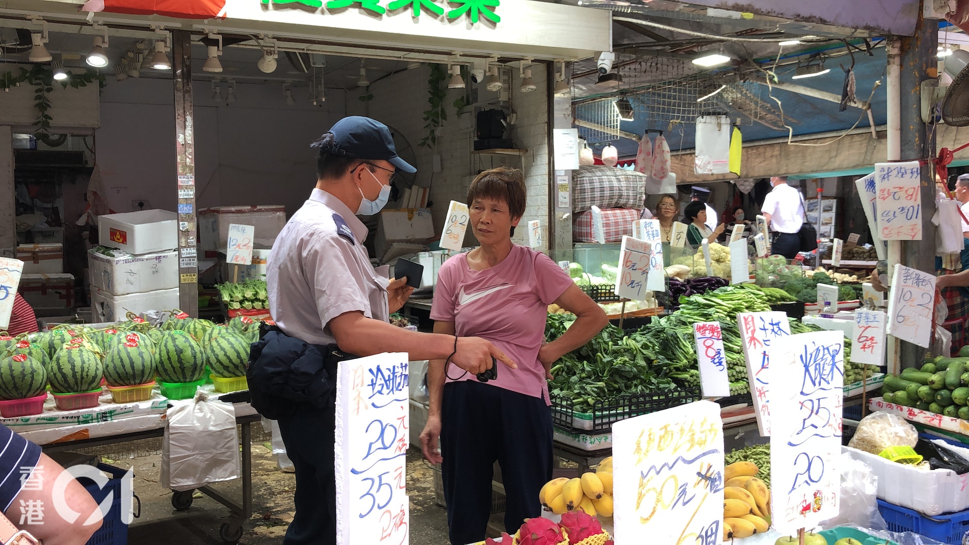 警方聯同食環署人員到牛池灣街市打擊店舖阻街,提醒店員把超出店舖範圍的貨品移走收好。(黃詠芝攝)