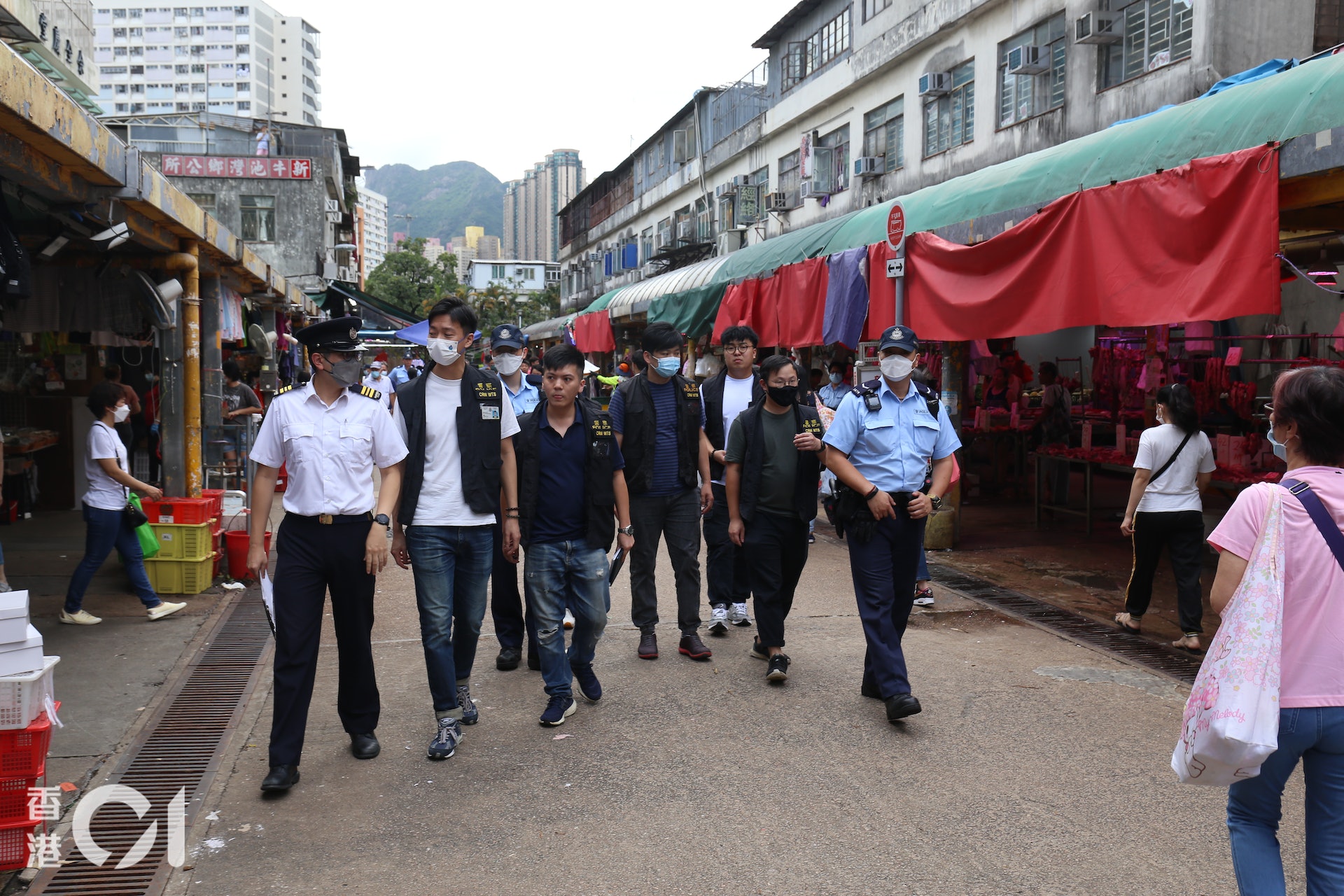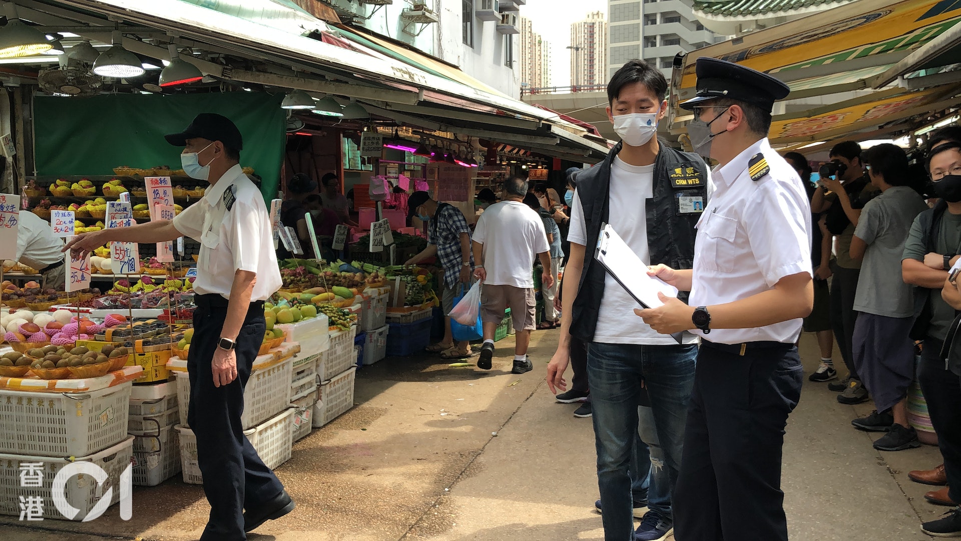 食環署人員「打頭陣」,手持相機拍攝牛池灣街市內店舖擺賣情況。(陳浩然攝)