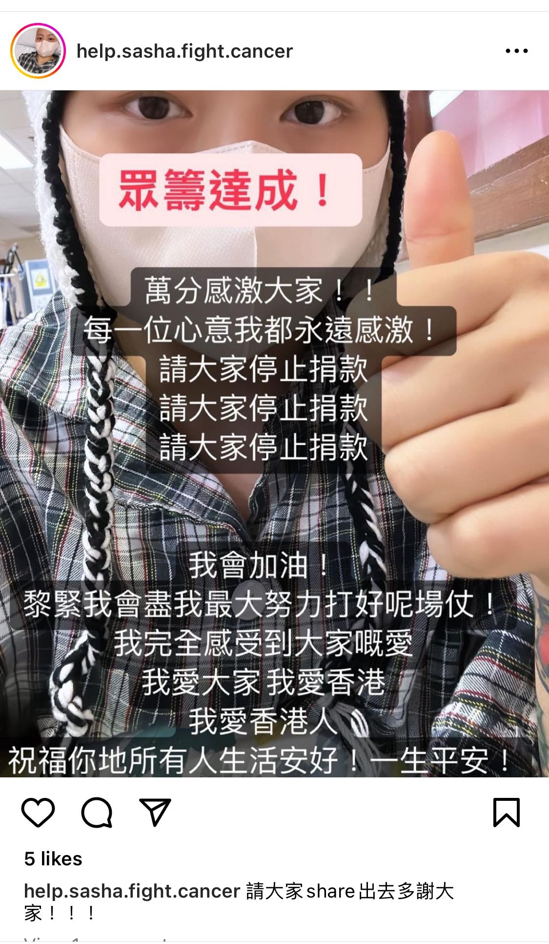 身穿醫院病人服的她舉起姆指示意「眾籌達成」,又表明將會加油抗癌,「我會盡我最大努力打好呢場仗!」她又對眾人致以感激:「我完全感受到大家嘅愛,我愛大家,我愛香港,我愛香港人。祝福你哋所有人生活安好!一生平安!」