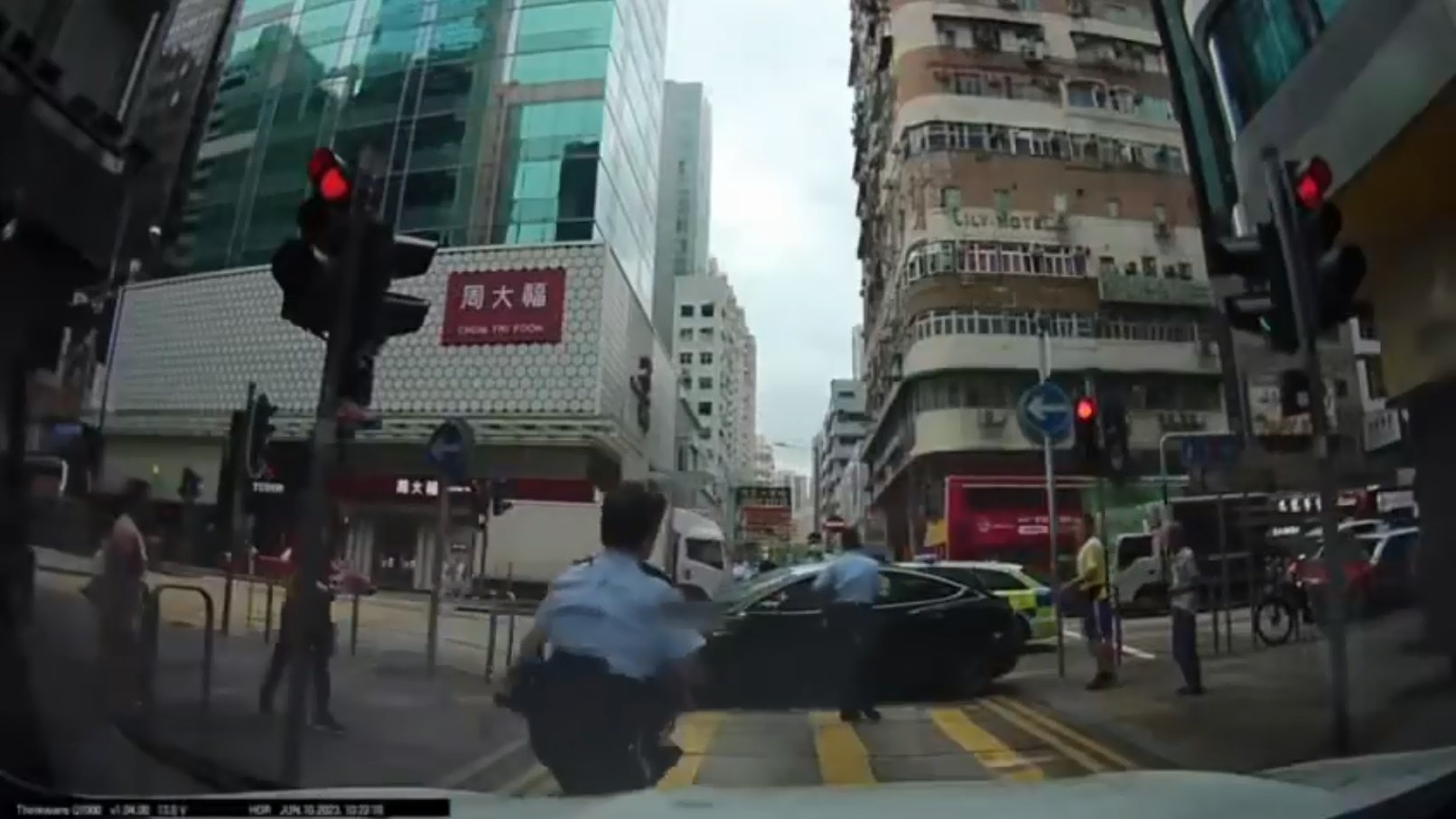 車cam主的妹妹向Channel C憶述:「恰巧警車在我們後方的登打士街抄牌,後方警察於是跑上前;彌敦道亦有警車追截該Tesla。」衝上來的白衫警揮出警棍;亦有警員衝上去嘗試拉開FU Tesla左前門,但曾多次拉不開。車cam主的妹妹又指,警察叫肇禍司機下車,才發現對方並非香港人,而是短髮外籍女。tvb now,tvbnow,bttvb |3 m) Q0 C( F4 H