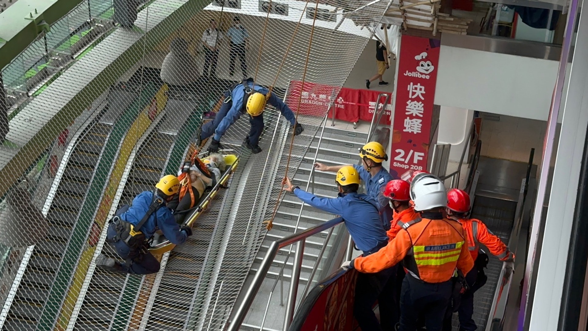 今日(17日)上午9時26分,深水埗西九龍中心有途人報案,指一名年約70歲的老婦疑高處墮下,跌在3樓的安全網內,神智清醒。救援人員接報到場,由扣上安全帶的一名消防員走入網內,替老婦扣上安全帶,然後小心翼翼將她扶起放在「山兜」內抬起,最後由救護車送到瑪嘉烈醫院治理。( L# ]$ p% @+ O