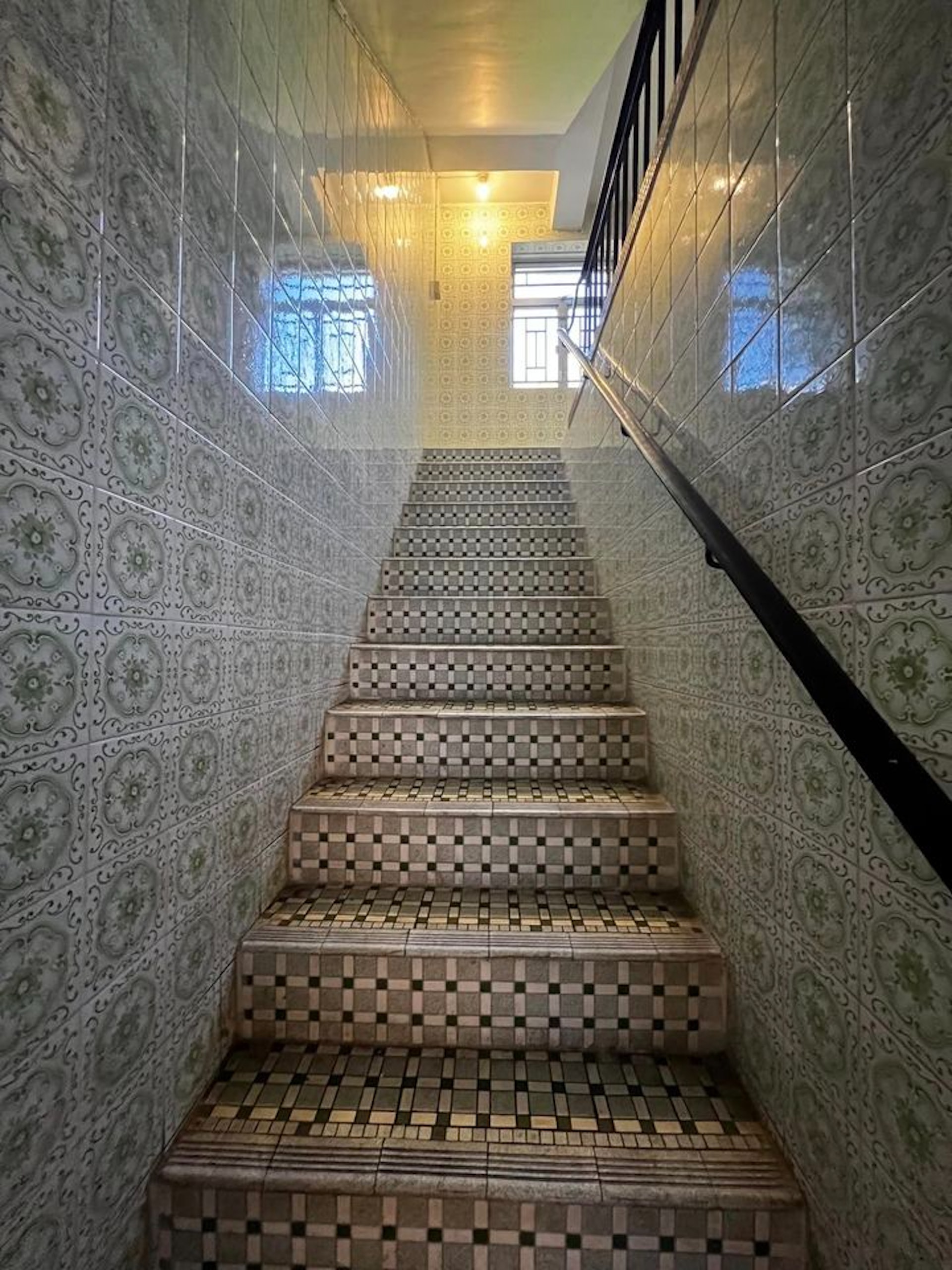 ! J1 Q. O; ~# a全幢村屋裝修極其詭異,地面及牆身均選用褐色、綠色和淺藍色瓷磚,圖案非常密集,網民直言「睇完頭暈眼花,有啲陰森」。(facebook群組「村屋(元朗)租/售」圖片)