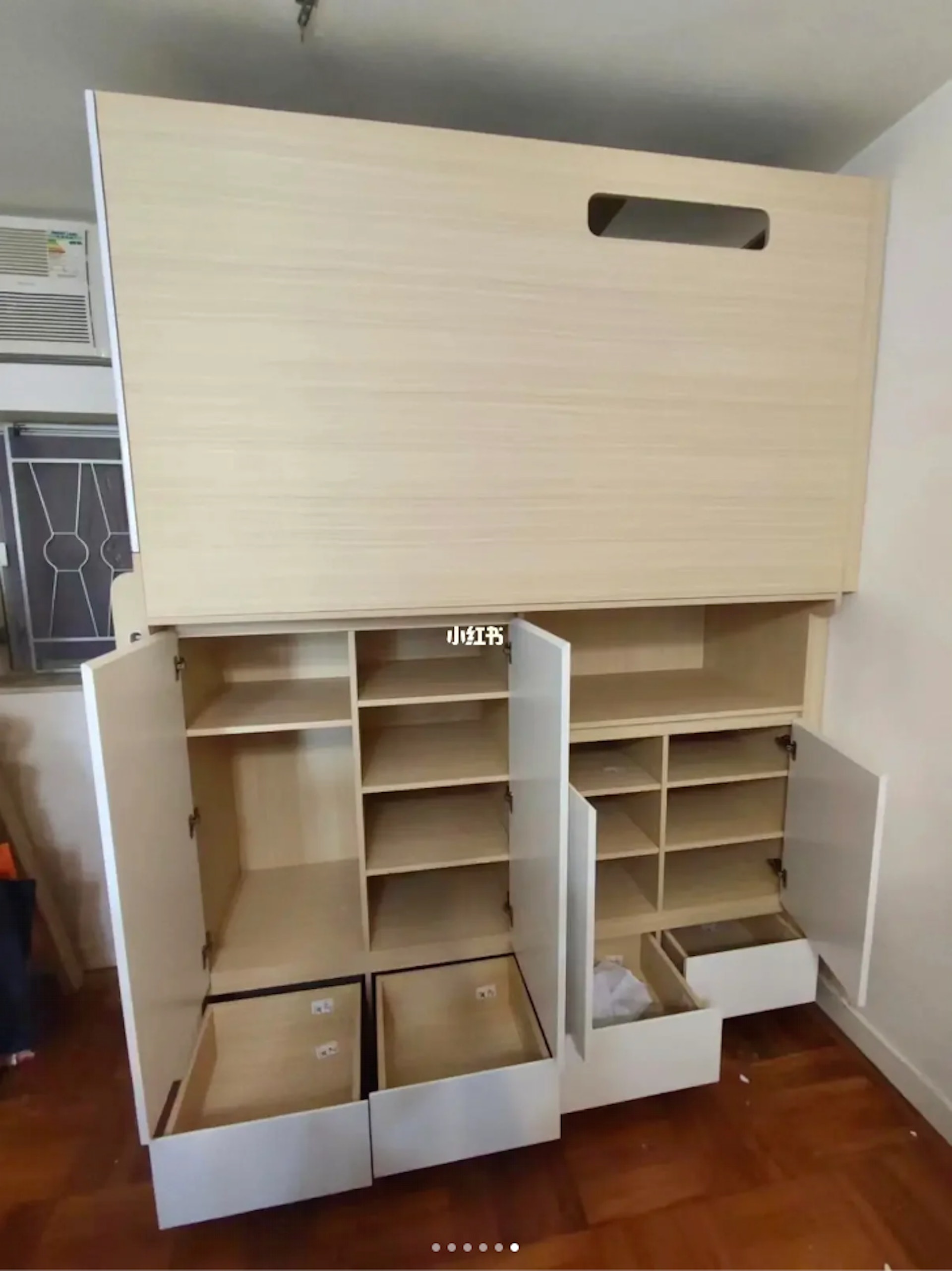 ; F. \: d+ }0 @( k$ a: q, W所謂「房間」以長方形兩層上下格設計,長194.5cm、寬68.5cm、高約250cm。上層為四方圍封的木板,留有一格小小的通風口,和設有格扇門邊氣;下層則是多個大大小小的抽屜櫃子,也有5階直身的梯級讓工人姐姐爬入上格床,相當「貼心」。