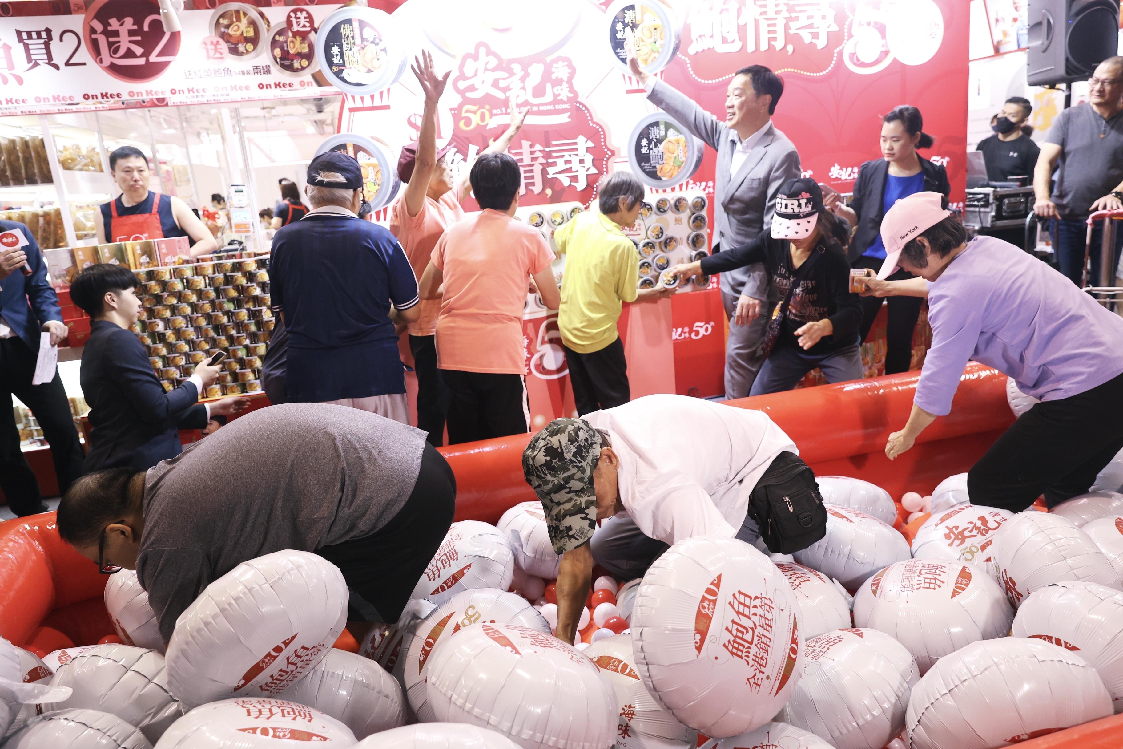 由貿發局舉辦的美食博覽今日(17日)起一連五日在會展中心舉行,今早十時已有大批市民排隊等候入場,有展商推出「$1鮑·情·尋」遊戲,勝出組別可獲得500罐即食鮑魚,其他組別則獲150罐。勝出組別為三位長者,其中有人提早三日即(15日)便到場排隊等候取得搶鮑魚籌號,三位參賽者雖年長,但耐力、體力甚至搶鮑魚的速度皆不亞於年輕人。有人勝出後更指會「餐餐食」鮑魚,也會與家人分享,笑言「撈麵撈飯食」