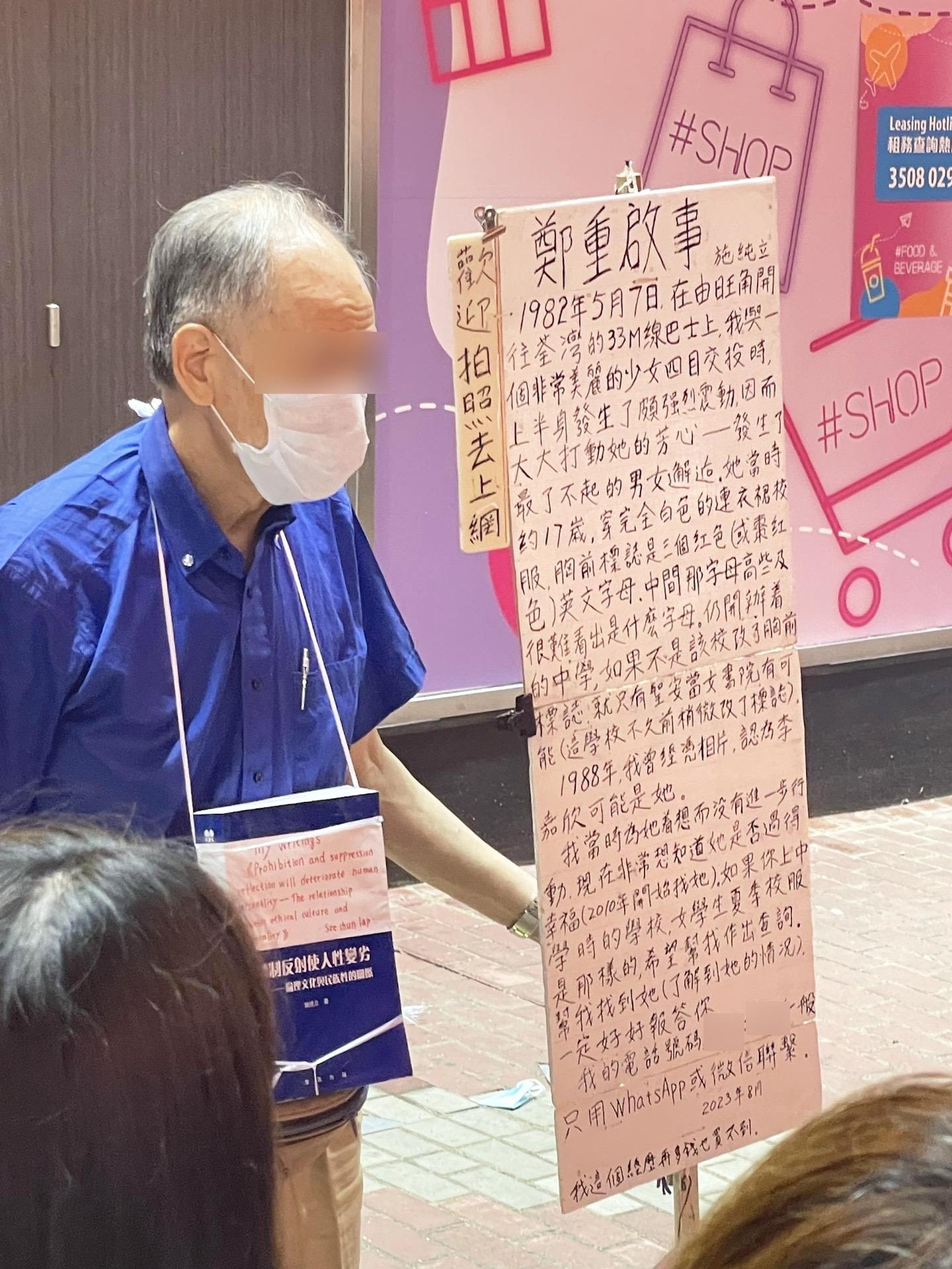 記掛着僅有一面之緣的意中人足足41年,天下間有多少人能做到?有網民日前於討論區發文,指行經旺角時留意到1名頭髮花白的老伯,手持寫滿字的尋人告示牌站於人來人往的鬧市街頭,仔細看才得知對方希望尋回1982年在巴士上邂逅的女生,更形容其經歷「再多錢也買不到」。網民看過老伯的告示內容,認為他多年來仍未有放棄尋找心上人的行為癡情又勇敢,紛紛為他送上祝福,「鍾意一個人無錯啫,無做壞事就得」。0 h6 m- h$ B1 X/ }- A$ @ Y