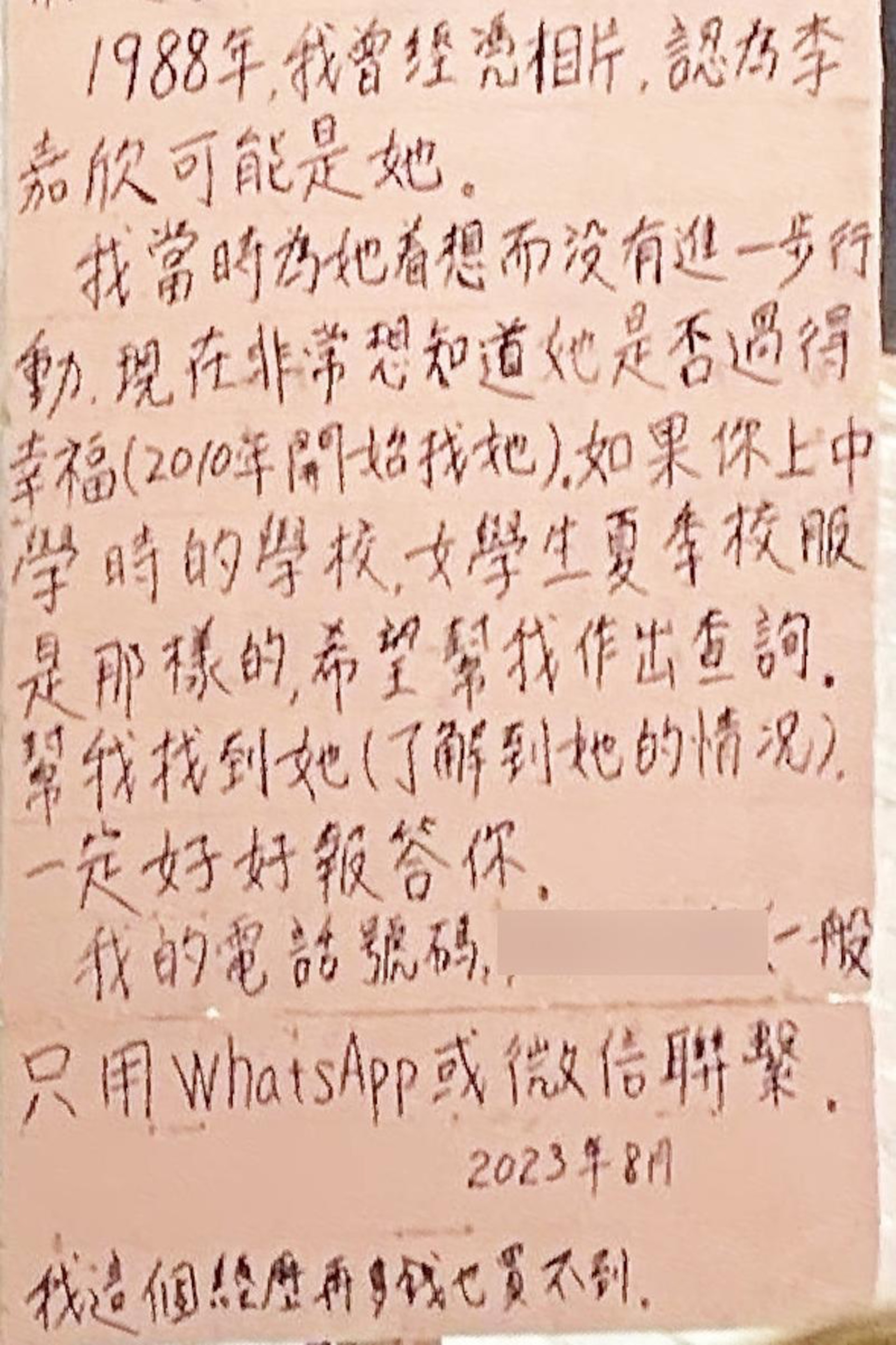 施伯伯於告示呼籲,當年就讀該學校的學生能代為查詢並找出少女身份,又形容「我這個經歷再多錢也買不到」。(連登討論區圖片)os.tvboxnow.com( s: q1 V& ]( |* p8 }( z' k
