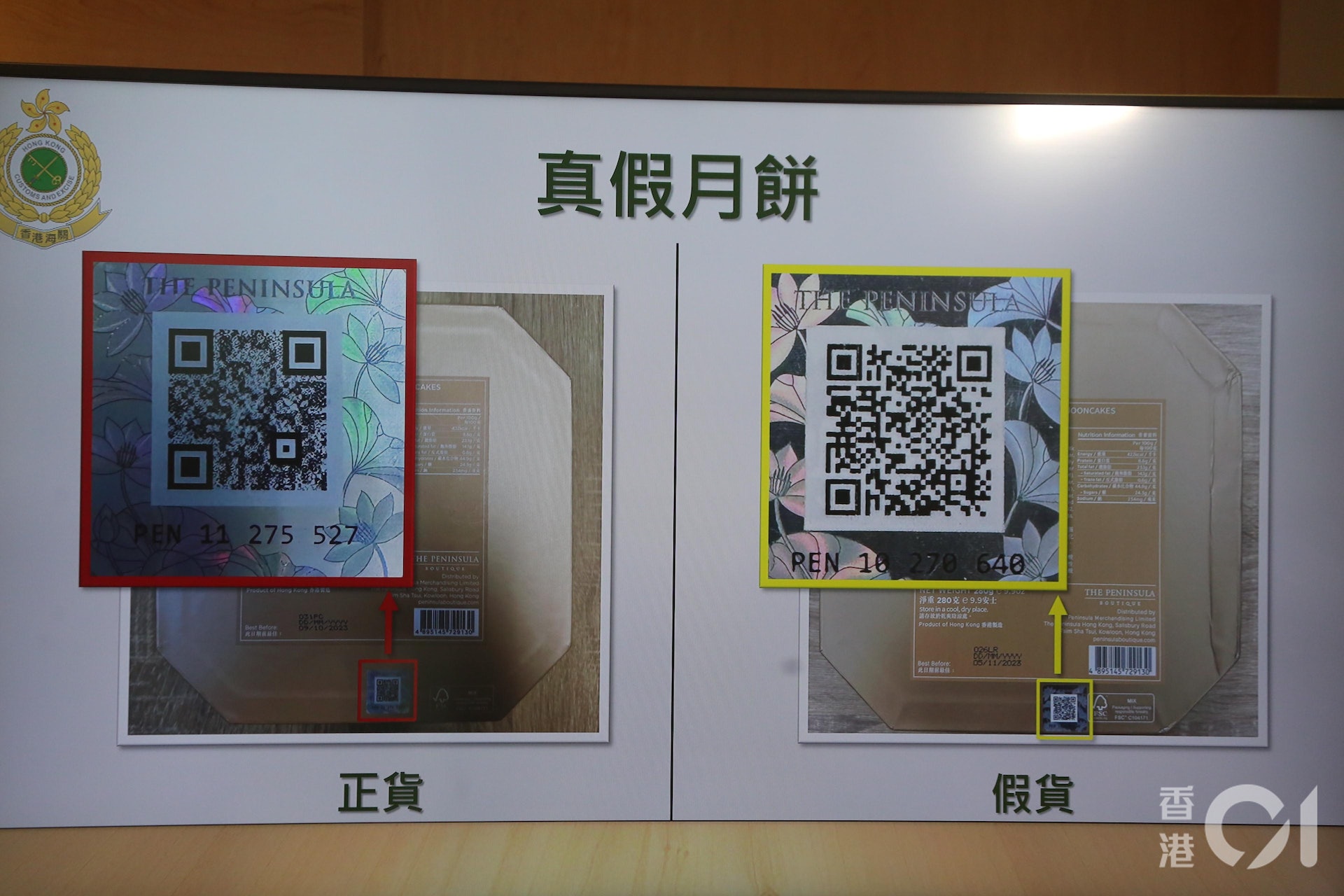 檢獲的冒牌月餅為「美心流心奶黃2023」和「半島酒店迷你奶黃月餅」,以正貨的七至九成價格銷售,主要抄襲正貨包裝盒外觀設計及註冊商標。海關形容「外觀上抄到八成似」,但市民仍可憑防偽特徵辨別真偽。
