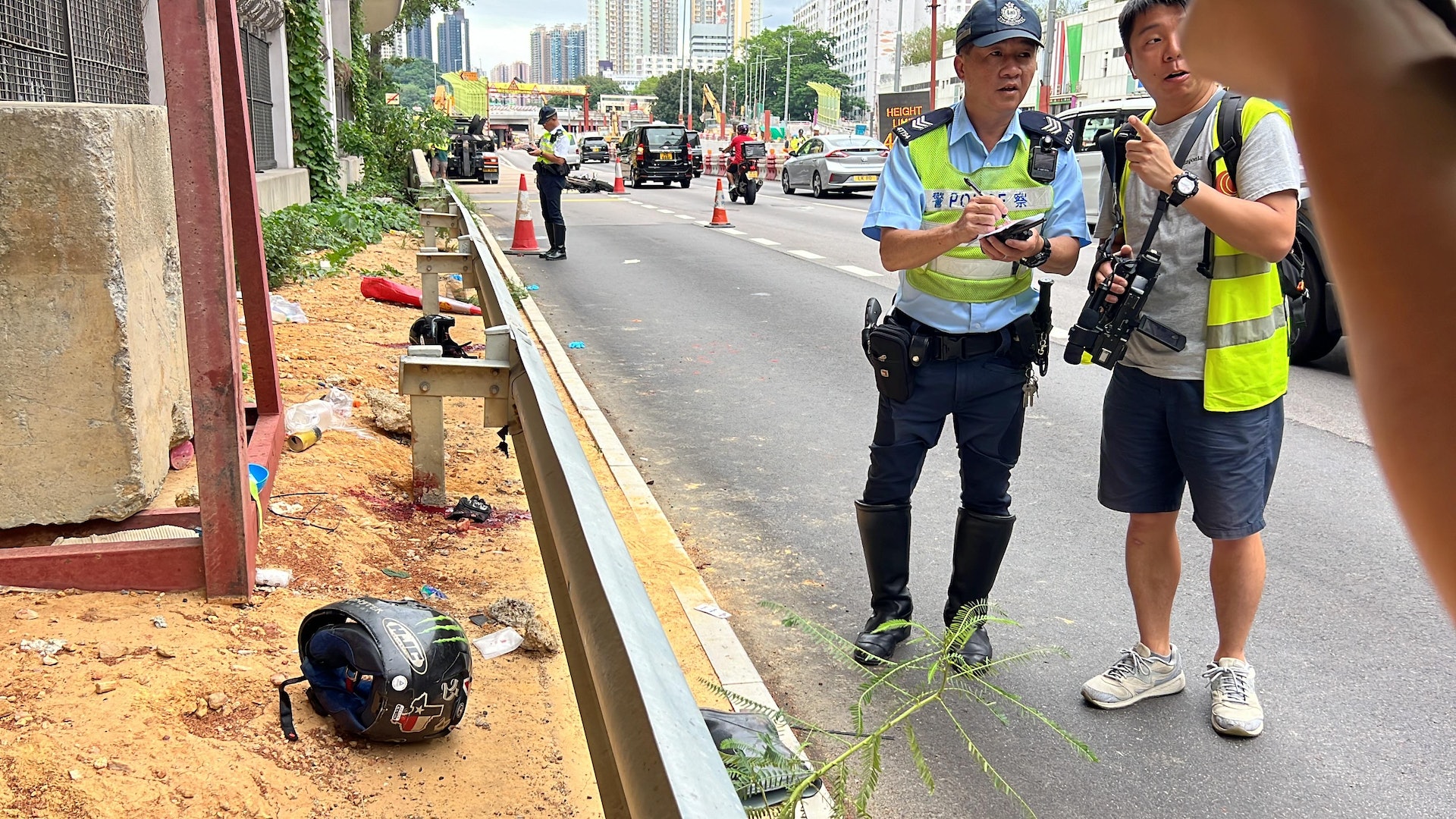 頭盔旁邊遺下大灘血迹。(翁鈺輝攝)os.tvboxnow.com# S: d0 `% k/ S, y4 y