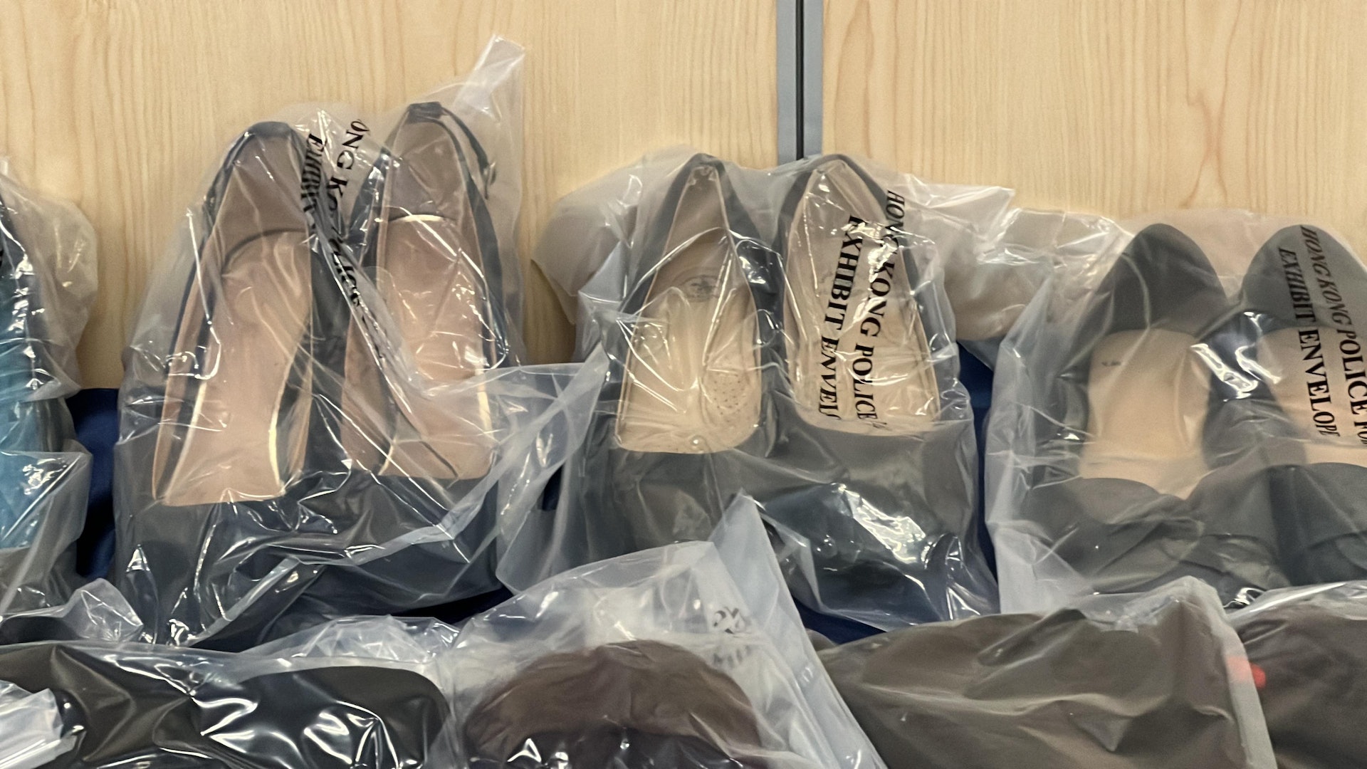 7 s0 o+ d* [4 h: L2 h* l: m/ \警方檢獲的證物,包括多對高跟鞋。(翁鈺輝攝)