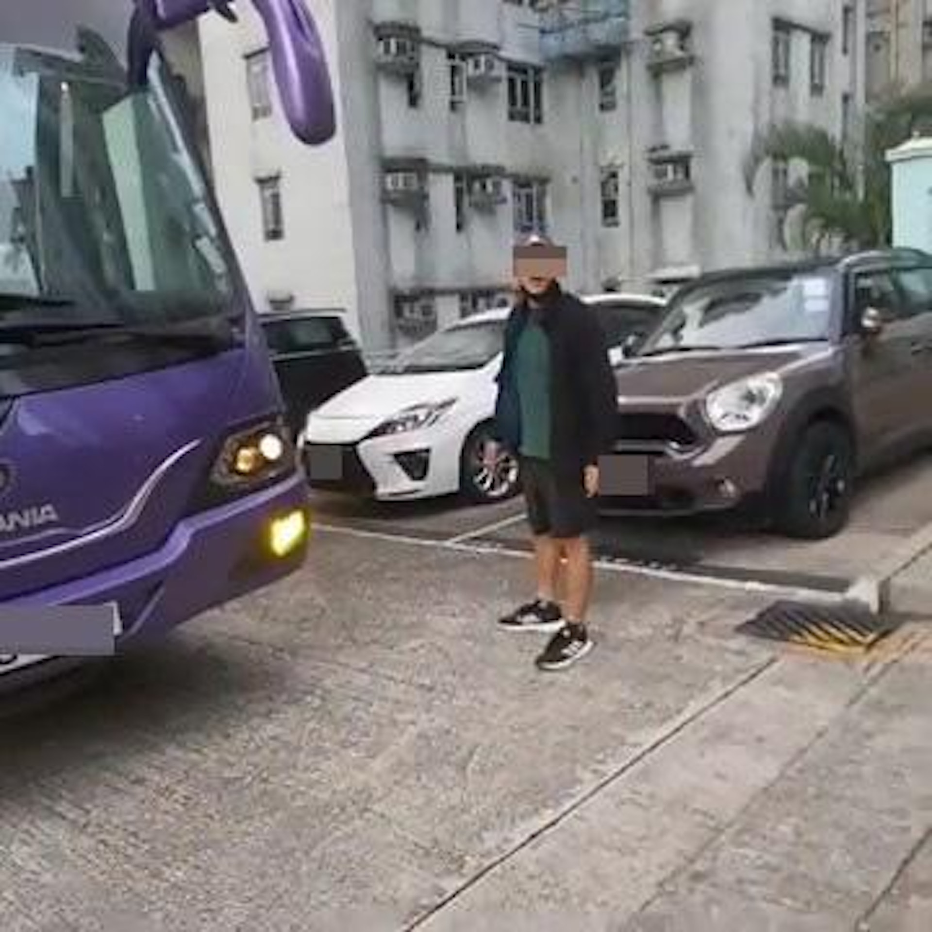 事發於10月25日,一輛校巴停泊在屋邨道路中間,車上有學童,左右兩旁車位也有泊車。其中一輛的士疑欲開車,但被擋路。一名戴眼鏡、穿短衫短褲男子,疑是的士司機,他站在校車頭前方,用手機拍攝。" W" e# i! H# n# ^, w1 {! D2 z