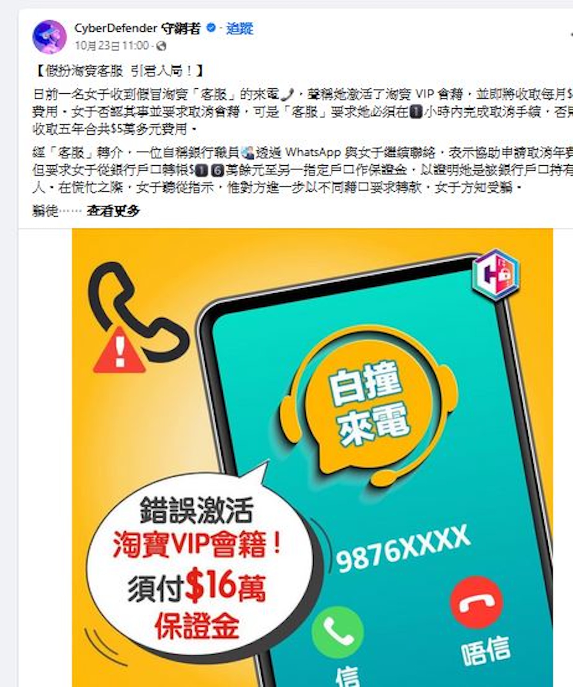 該港女於Facebook群組「淘寶開心share」發文分享近期「新騙案手法」,指操粵語騙徒假扮淘寶職員,指受害人已參加「特惠VIP」會員計畫,需要繳交年費880元,並會透過淘寶户口綁定銀行自動過數。