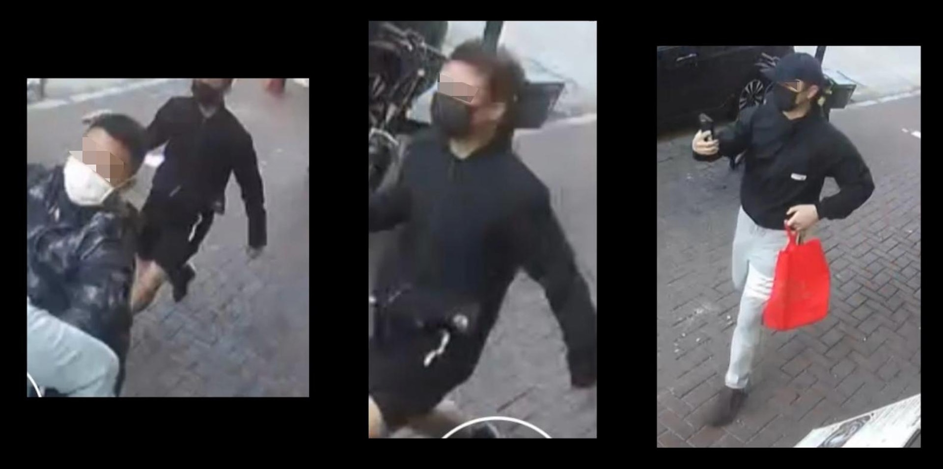 上月25日傍晚5時許,事主沿庇利街往馬頭圍道行走期間,突然被兩名穿黑衣、戴口罩男子以鐵錘從後襲擊,另有一人從後緊隨拍攝。(讀者提供)+4