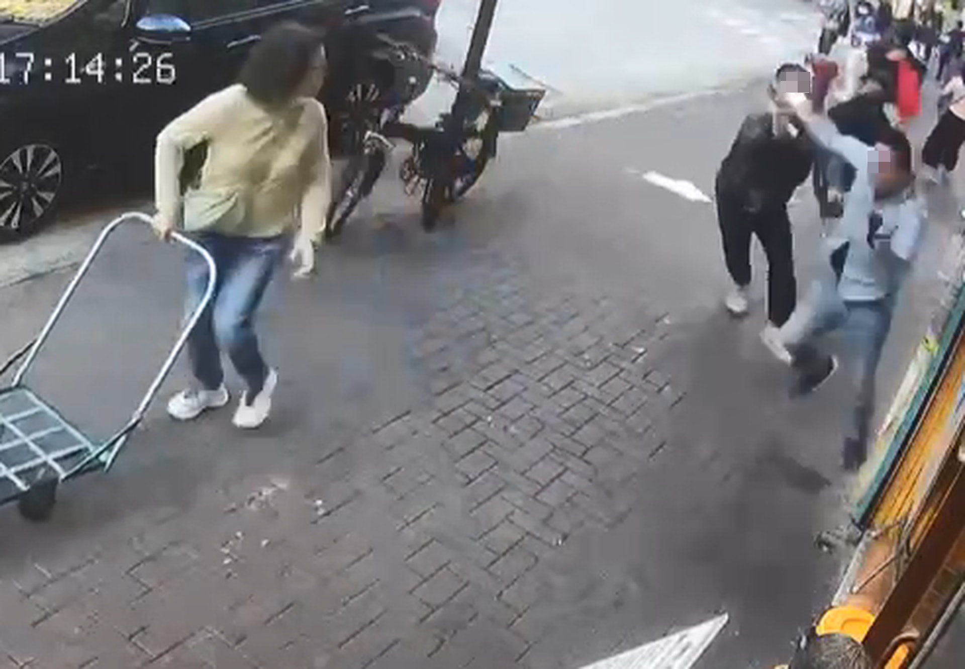 ) g& H6 @: Z2 d+ l3 c) P0 p7 t其中兩名兇徒持鐵錘施擊,事主試圖擺脫糾纏及逃走。(讀者提供影片截圖)5 W4 f* }4 N( l# _) d' t