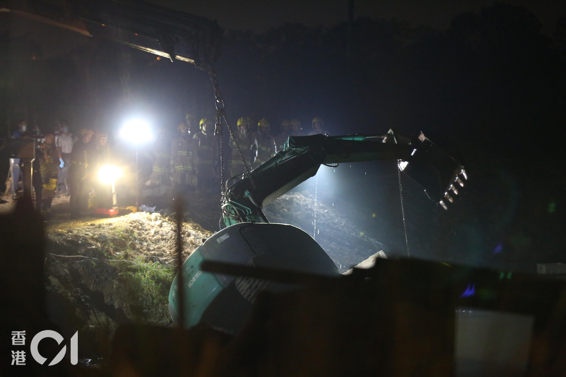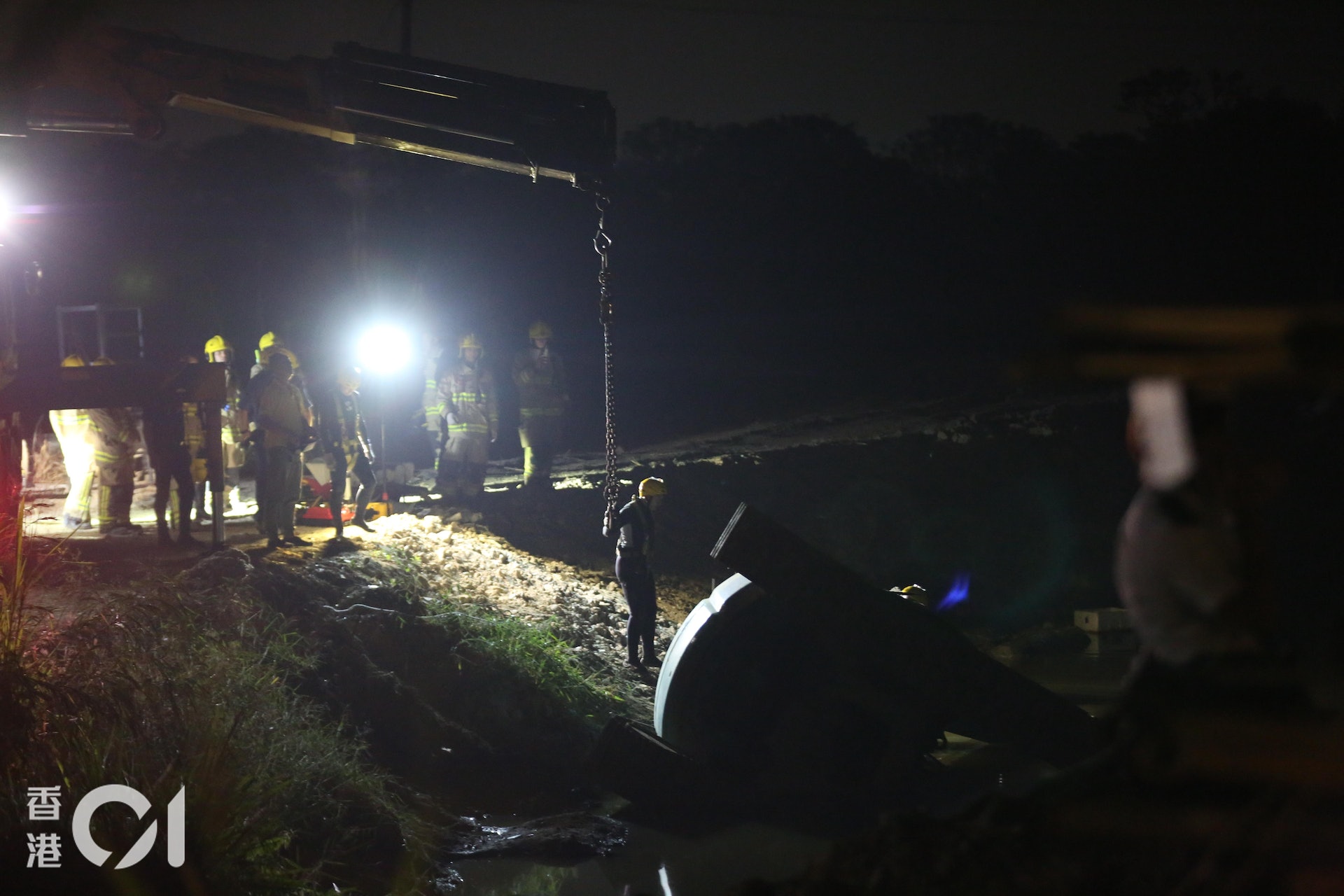 " _- K: C$ n% ?5 M6 B( W( J元朗大生圍有挖泥車跌入魚塘,消防到場搜救近兩小時後,救起一名失蹤男子,他已陷昏迷。(王譯揚攝) |