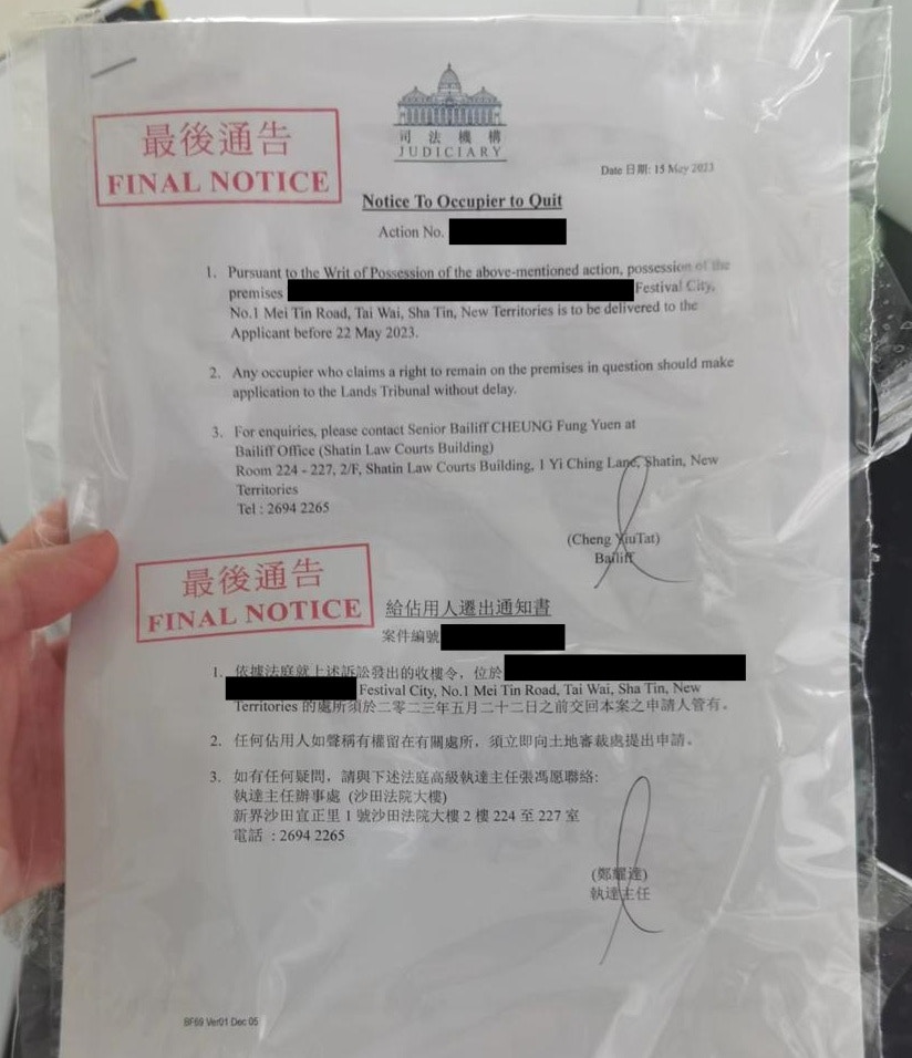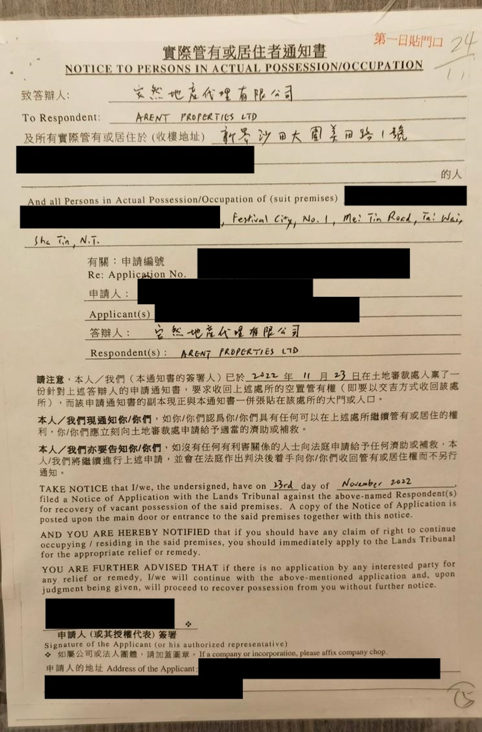 但搬進去三個月後,楊生的單位貼有土地審裁處的通知書,答辯人是與楊生簽約的地產公司「安然地產」。他們始後才發現涉事地產經紀劉帥榮拖欠了業主兩個月租金,並無全數交予業主。但劉經紀稱不會影響他們入住,當時未有多加理會。# k5 b0 Y) t6 k/ S