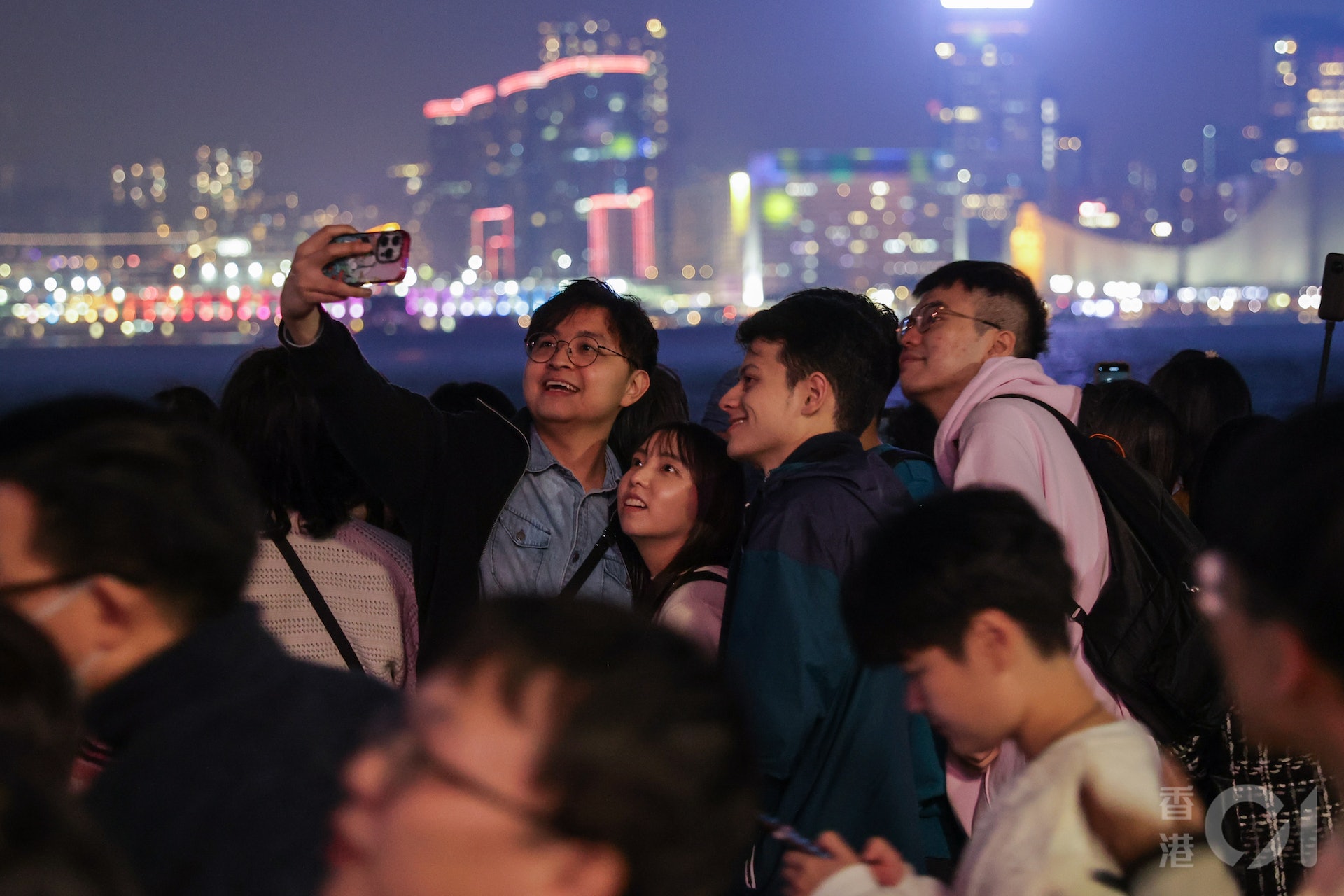 % ]7 R& y" ?2 @! I' E% X! E0 q「香港跨年倒數」維港煙花音樂匯演2024年1月1日元旦凌晨0時上演,在尖沙咀海旁觀看的市民及遊客,莫不舉起手機拍攝。(廖雁雄攝)