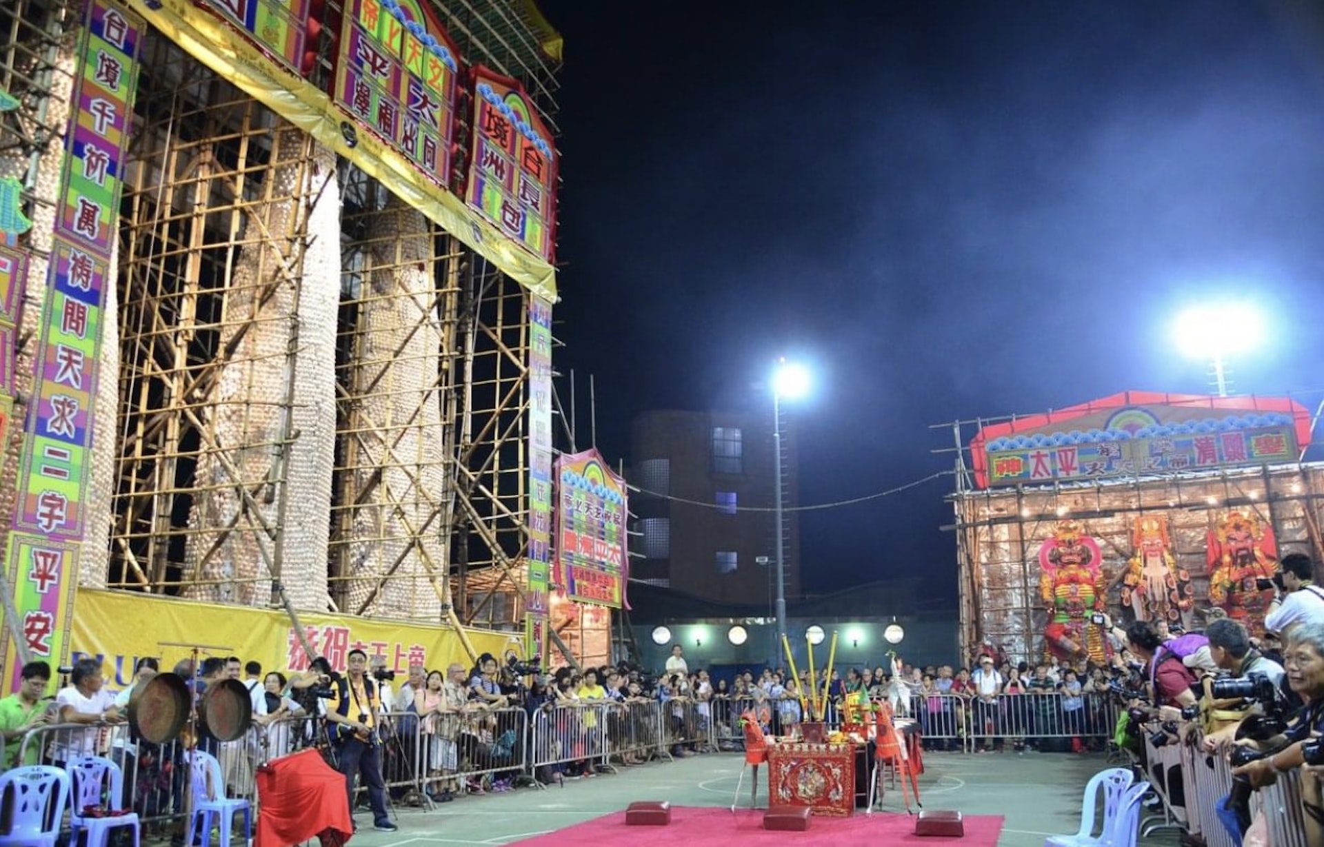 2019年5月11日(佛誕前夕),北帝廟前有三個用竹棚搭成、掛滿平安包的包山,用於祭祀。(資料圖片/黃桂桂攝) |