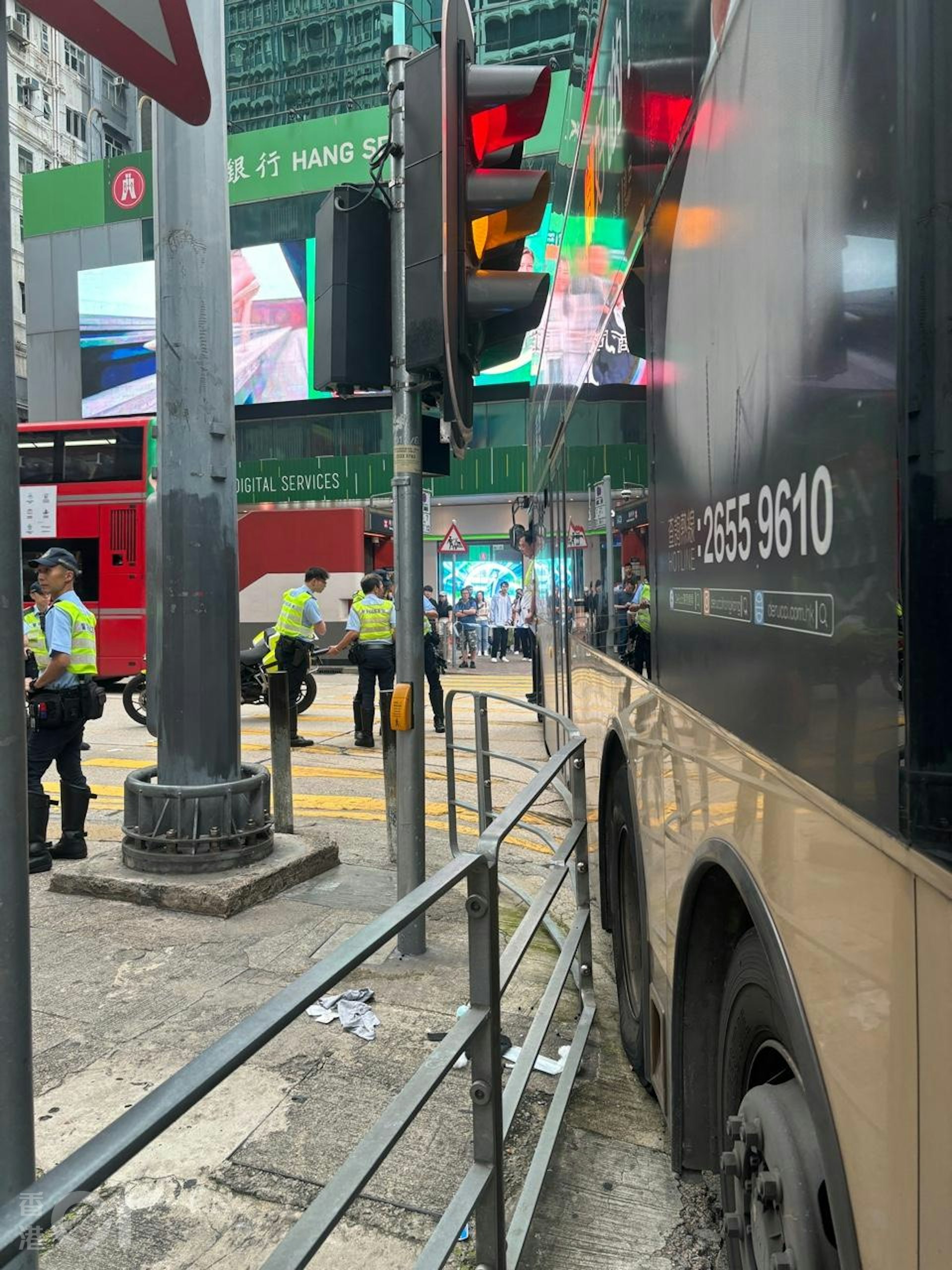 男傷者被夾於巴士與鐵欄之間。(facebook / 馬路的事 (即時交通資訊台))