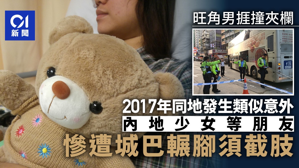 7 x9 U+ `- }; k6 h/ Q5 h2017年11月1日下午4時許,18歲內地女遊客黃曉儀攜同行李箱,偕友人在上址等候橫過彌敦道,因行人眾多,她與朋友並排站於轉角處行人路邊的欄杆之外。當交通燈轉綠時,一輛A21城巴由彌敦道左轉入亞皆老街,女事主放開行李箱欲後退,但受後方欄杆所擋,最終被巴士撞倒,右腳被輾過。+ M0 P. N$ O7 i# J/ l" |