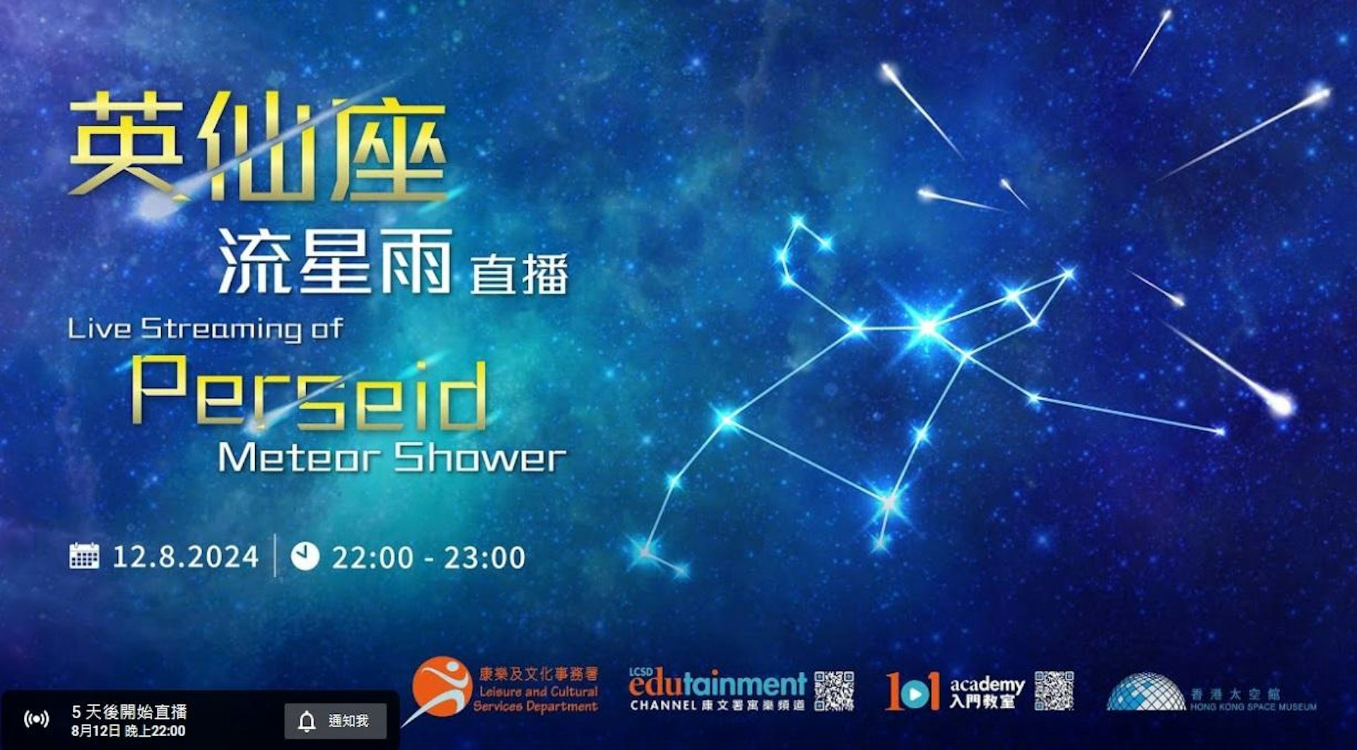太空館在YouTube的直播預告中表示,今年英仙座流星雨的高峰期為8月12日,其天頂每小時出現率可達到100,當晚將於網上直播是次流星雨現象,太空館助理館長張頴珊將會並即時講解觀賞流星雨的方法,以及相關的天文知識。tvb now,tvbnow,bttvb, }+ O) |* g" h% ?" b( ?# t0 t7 ?