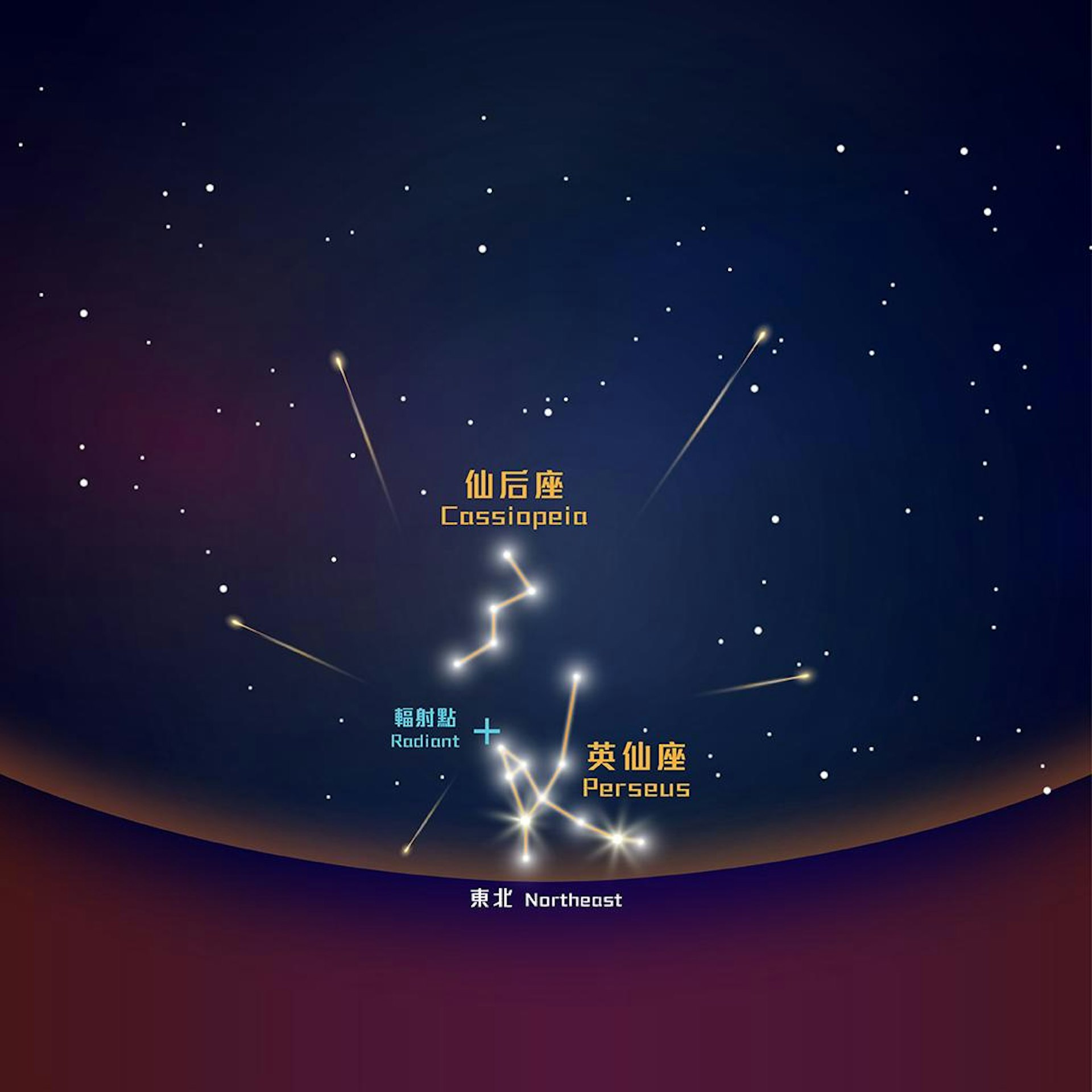 英仙座流星雨最佳觀賞時間在地區分布。(太空館圖片)