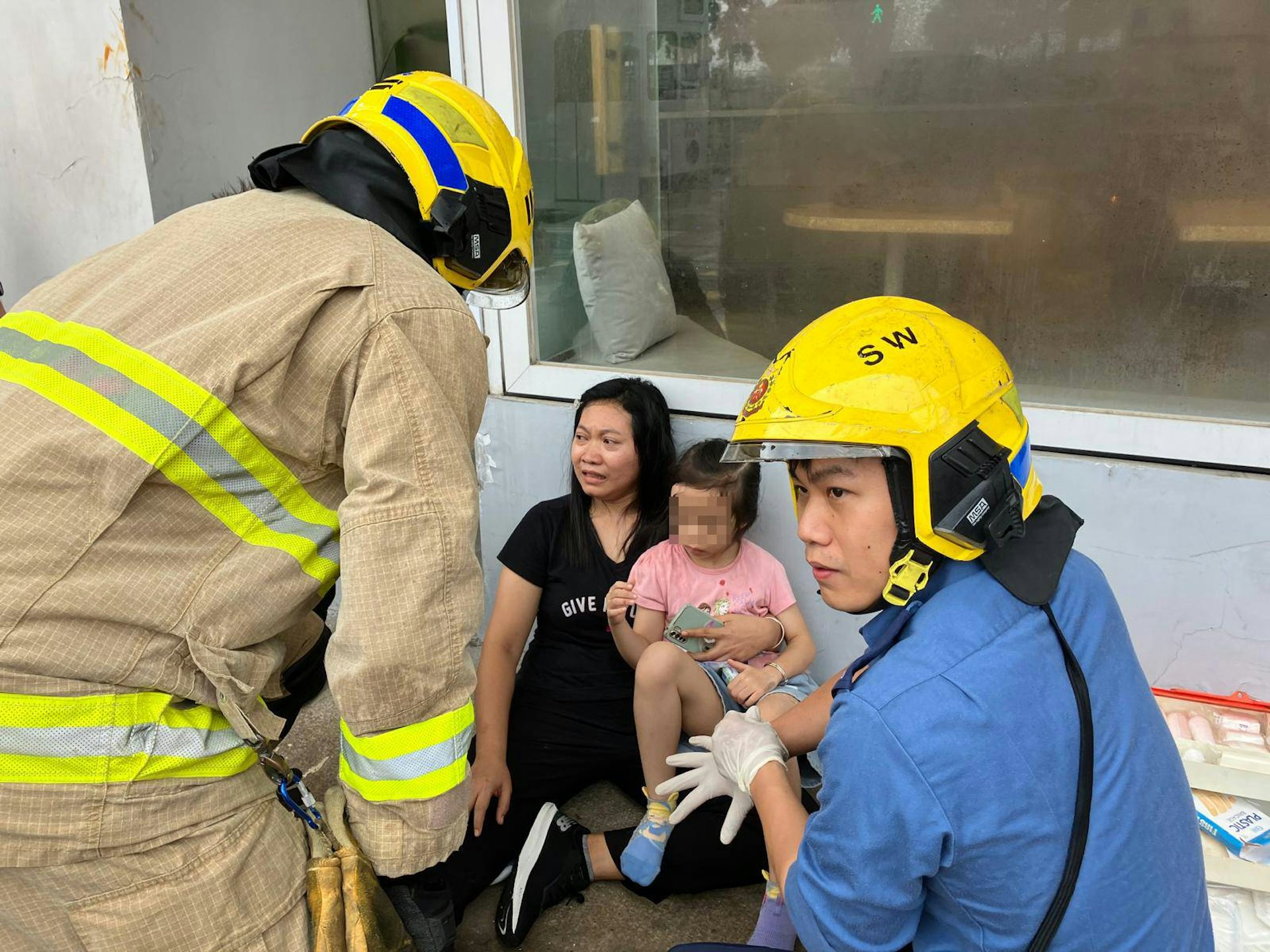 $ l4 B4 p2 v$ r) M5 h- e+ _女童右前額貼有膠布,胸前有小量血迹,由同行女傭陪伴照顧。(讀者提供)/ i; Z8 U9 x2 s% M% ^, c3 a# {8 Q3 L