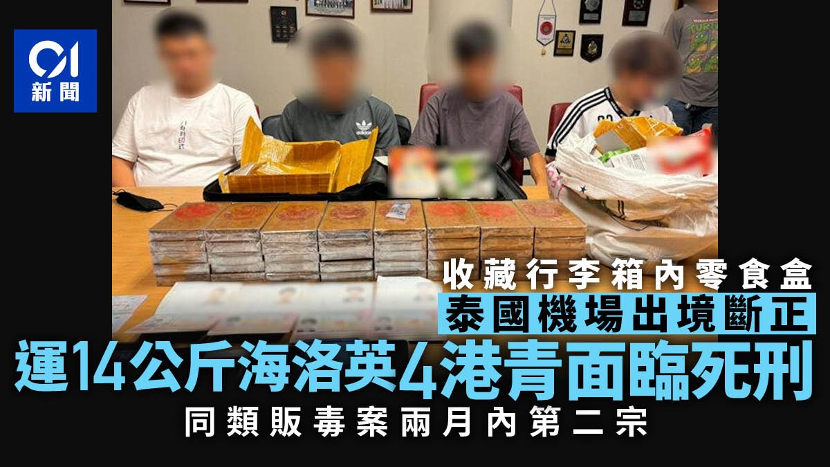 泰國傳媒報道,曼谷素萬那普機場(Suvarnabhumi Airport)上周五(16日)拘捕四名香港青年,從他們的行李篋內零食盒,搜獲重達14公斤的毒品海洛英(Heroin,又譯作海洛因),原準備運返香港。這為近兩個月內第二宗同類個案,根據泰國法例,販運海洛英可被判死刑。