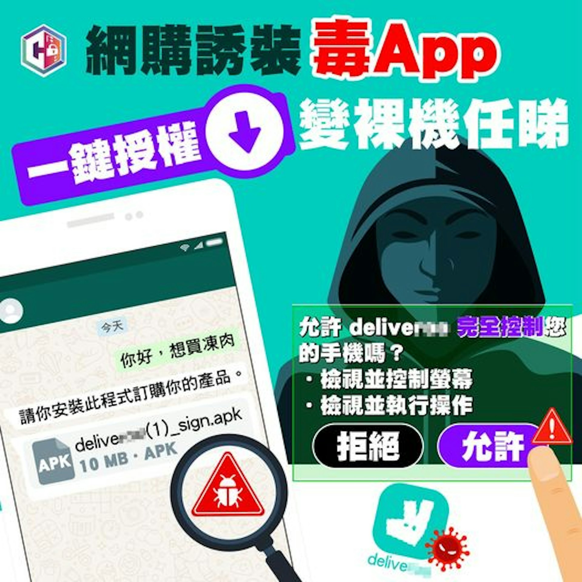 假冒外賣平台「戶戶送」有毒應用程式再現,用戶如不慎下載黑客提供的APK檔案,安裝及允許毒App完全控制手機,手機隨時變「裸機」任黑客入侵,一名男子便因此痛失57萬元。