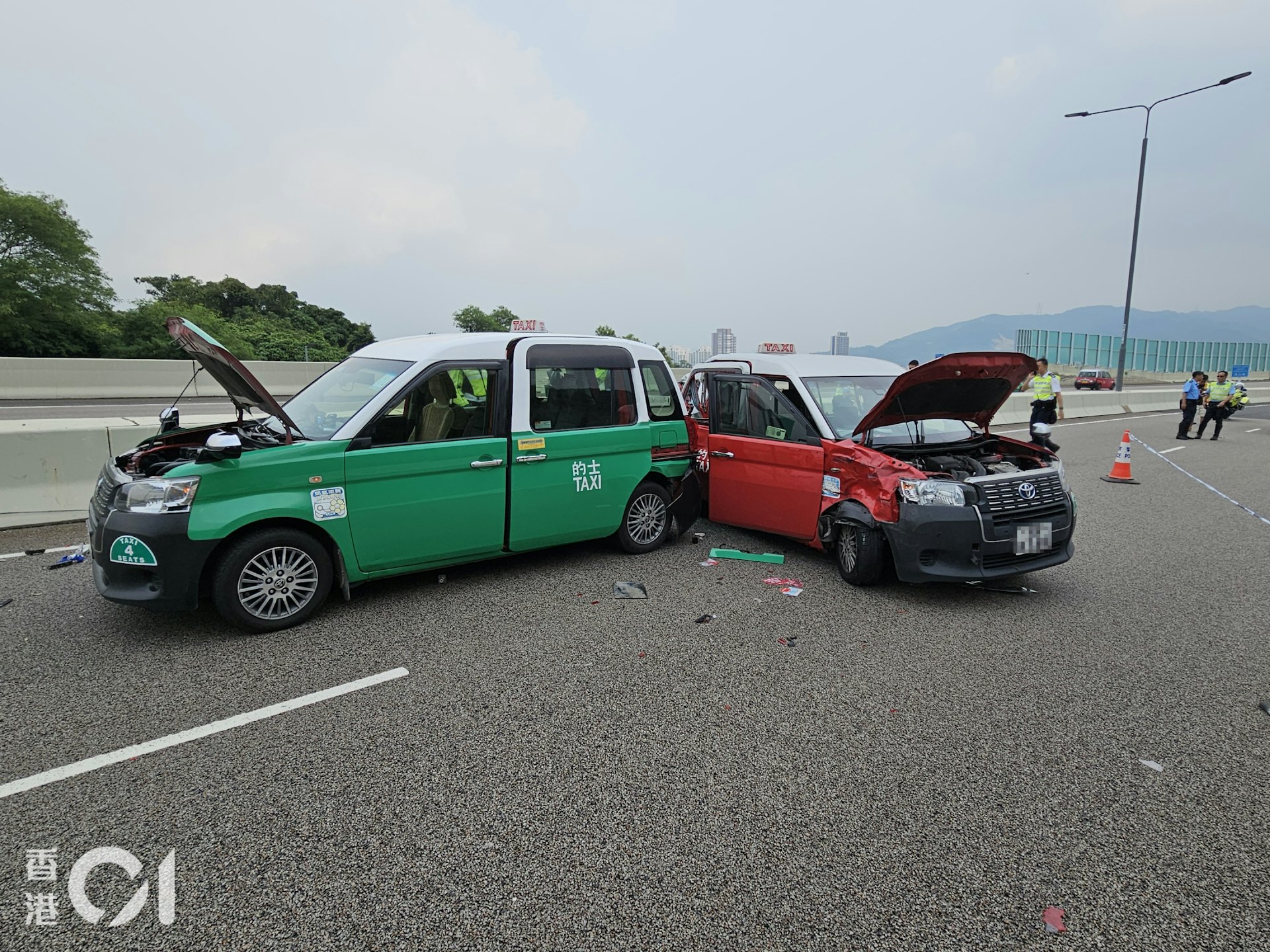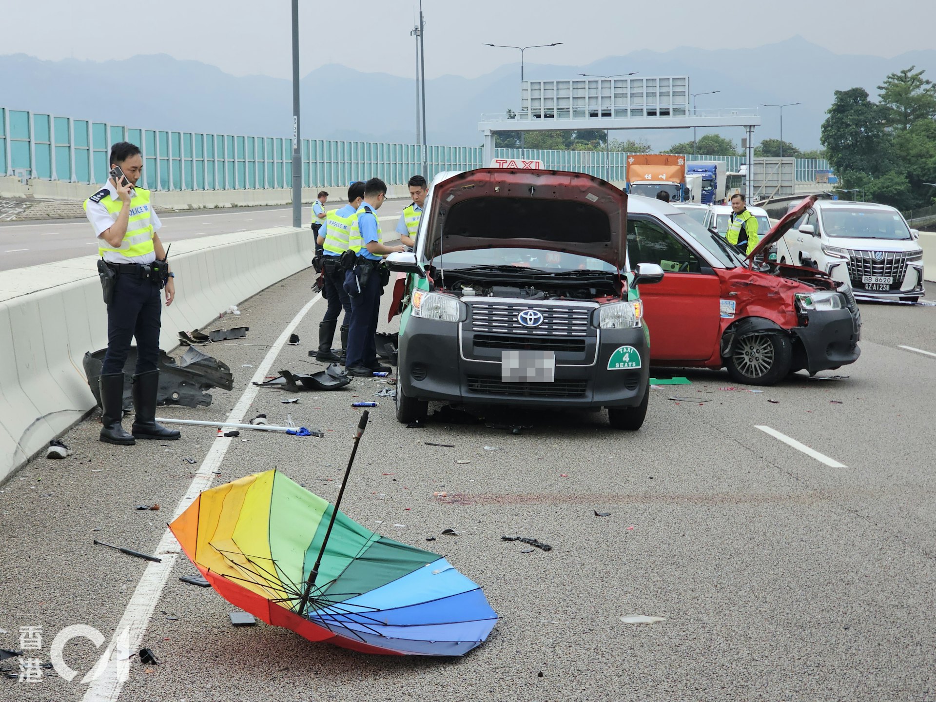 港深西部公路發生嚴重車禍,涉及兩架的士和一架中港牌四驅車。(梁偉權攝)