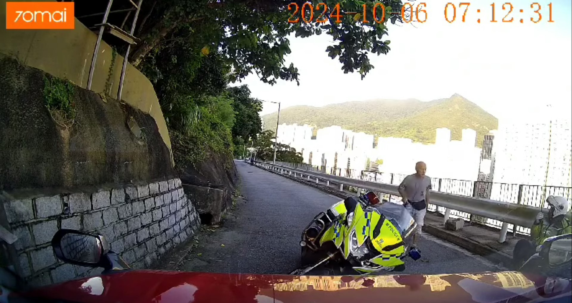 電單車向左傾側,警員手扶受傷腰部,背靠防撞欄坐於路邊。(交通意外求片區 Facebook)os.tvboxnow.com& I7 ]! \# Z: N3 c, B; m