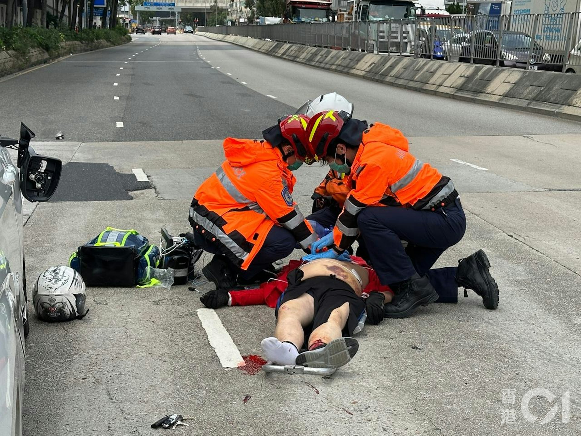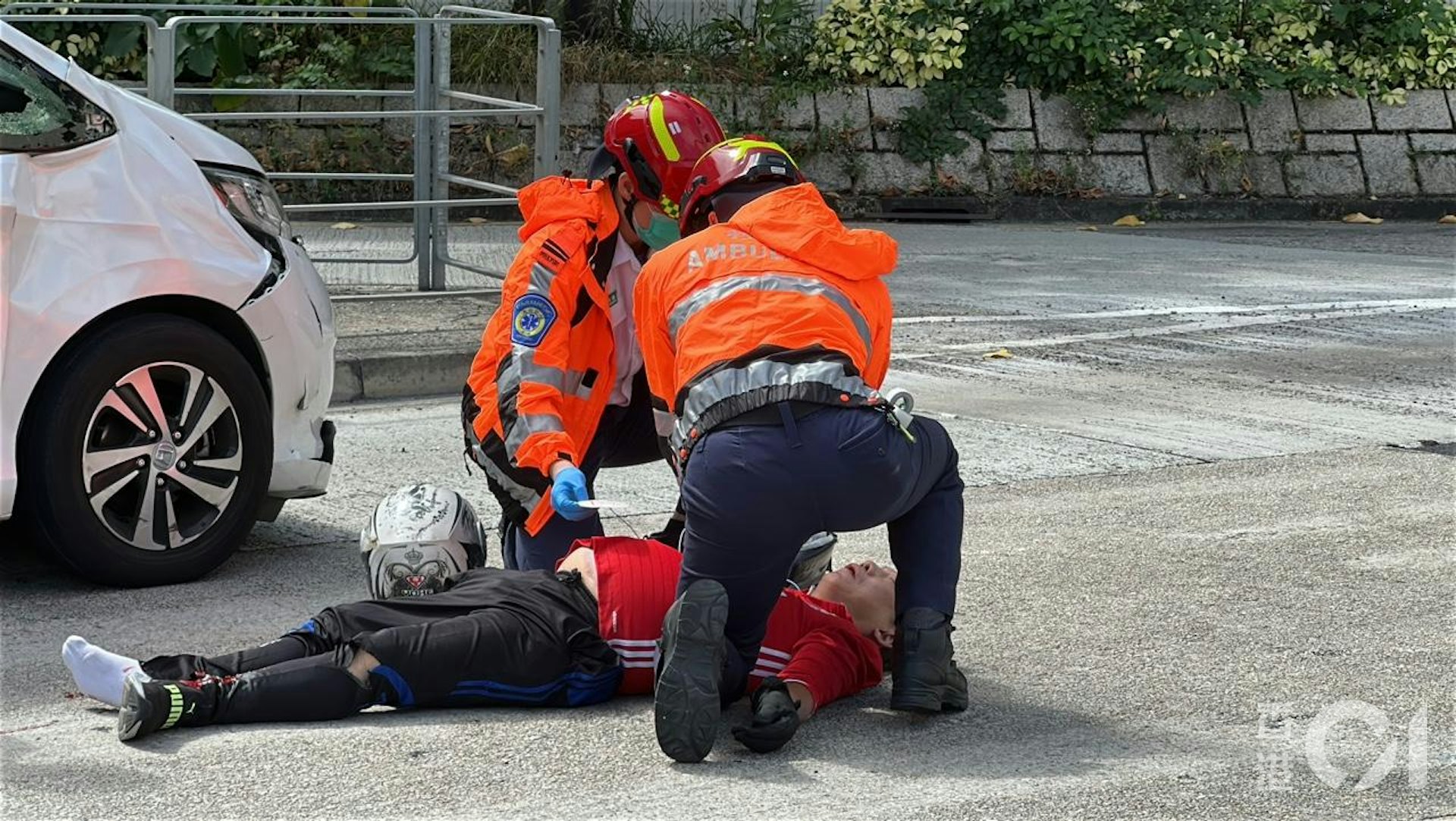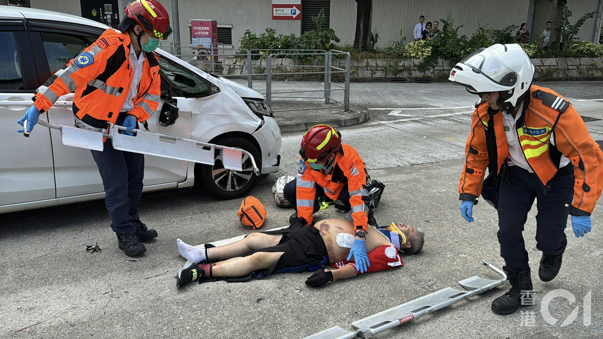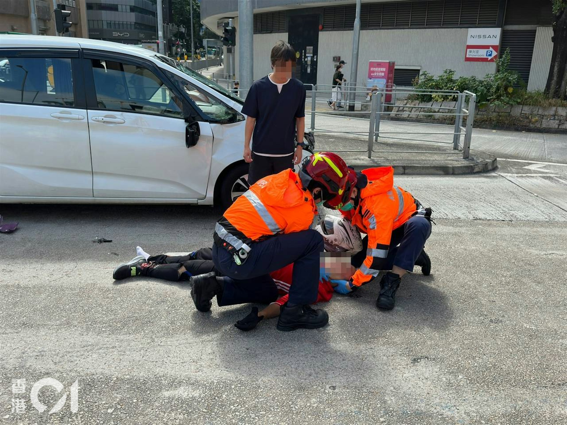 2 i% r, o f% R. P% B ?os.tvboxnow.com私家車司機看着救護員替鐵騎士急救。(翁鈺輝攝)