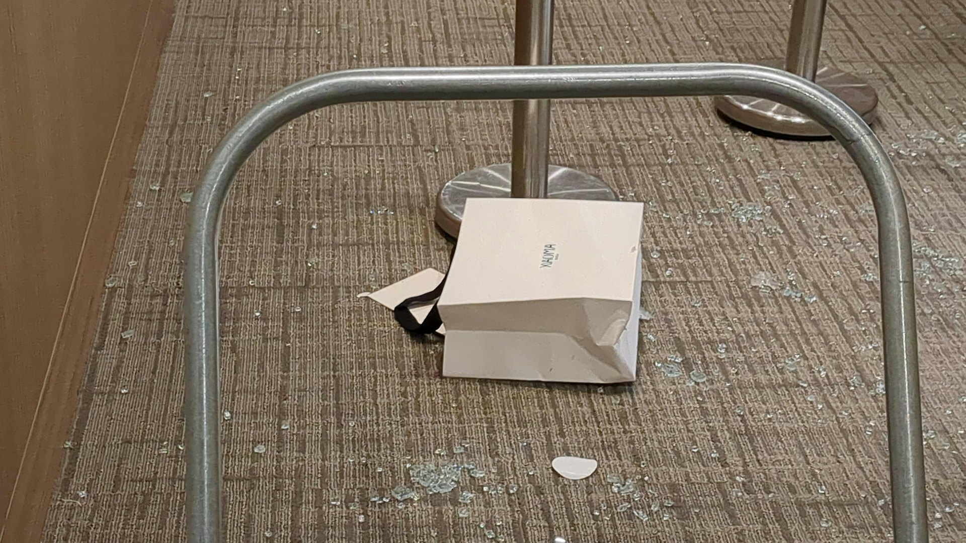 # f/ u( f8 a( t5 u公仔箱論壇現場是皇后大道中新世界大廈17樓的GINZA XIAOMA,單位的玻璃門粉碎,地上遺下一個疑用作砸爛大門的工具。店內有一列玻璃飾櫃,放有數十個Hermès手袋。惟部份飾櫃的玻璃被打爛,內裡掏空,玻璃碎散落,專屬的紙袋亦丟在地上。os.tvboxnow.com; Y! h) V6 R h8 y9 p( X9 H% n