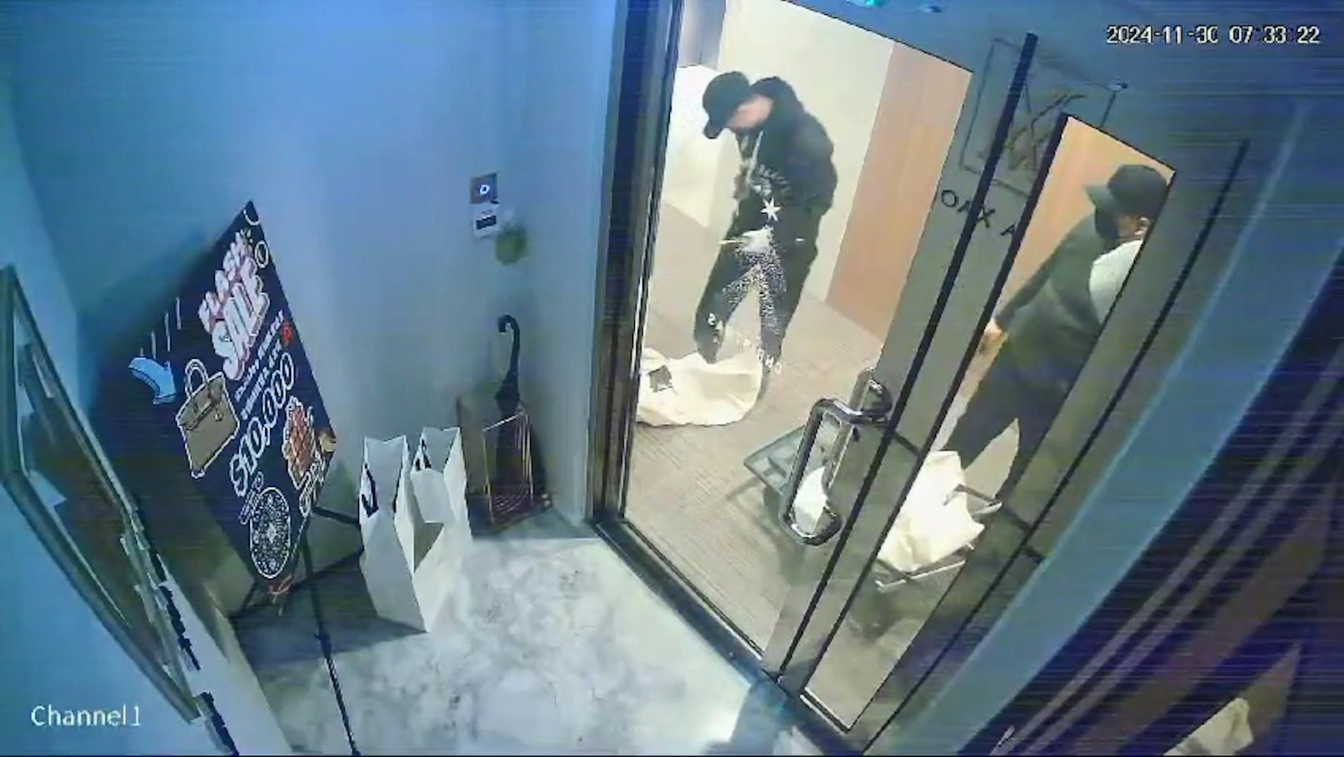 中環新世界大廈手袋回收寄賣店GINZA XIAOMA於11月30日早上遭爆竊,閉路電視拍攝到賊人由撬門至帶着3大袋手袋逃去的過程。(公司傳媒聯絡人提供)