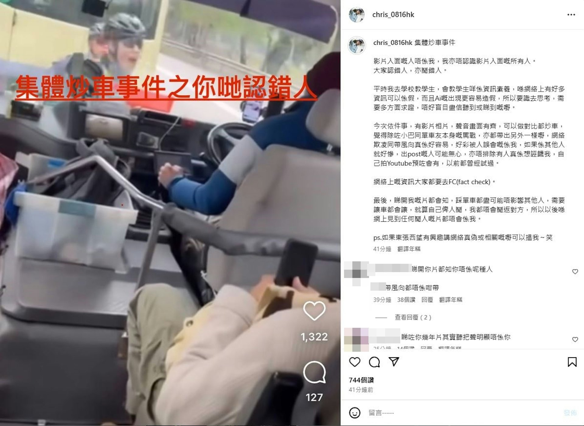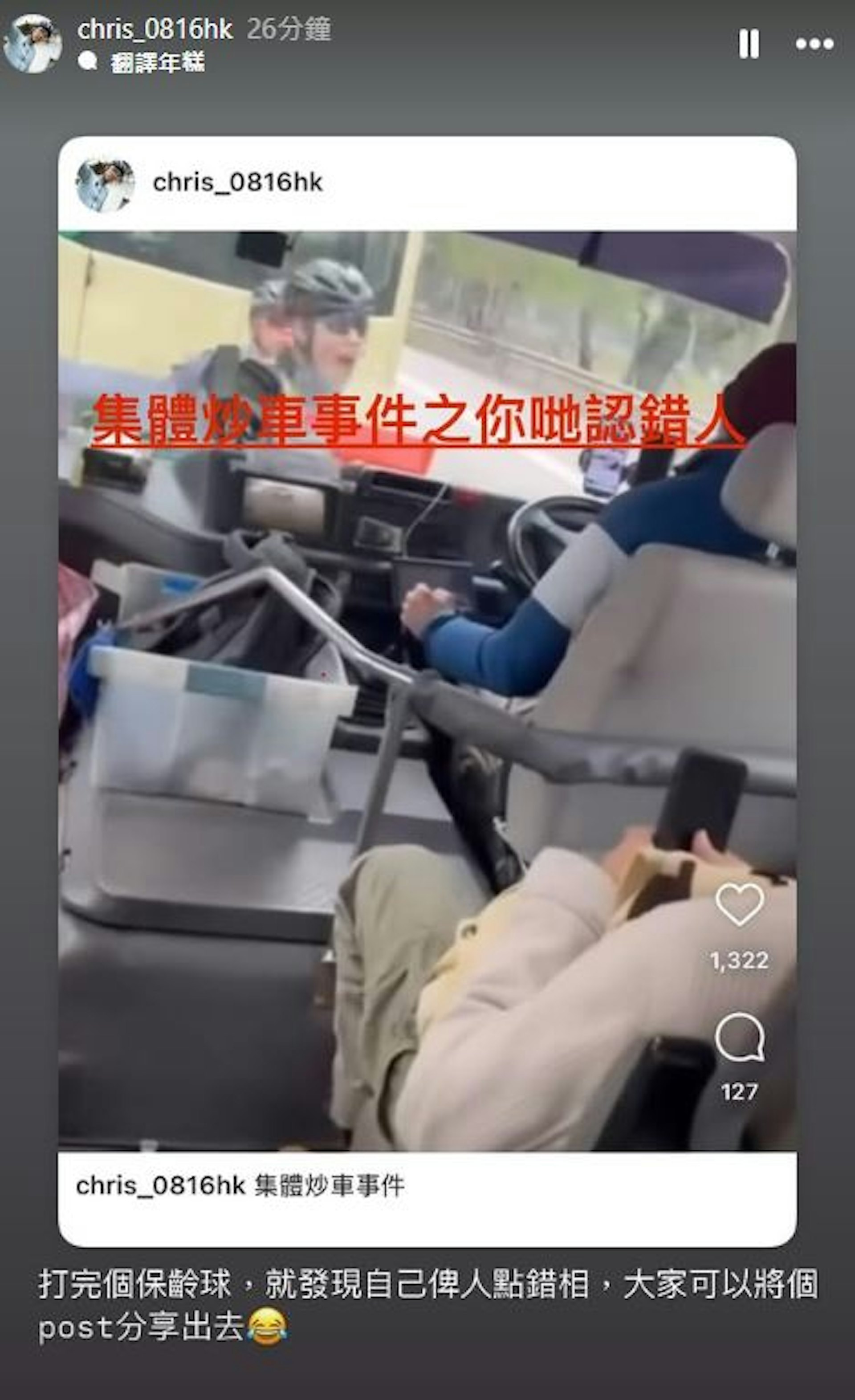 ' U+ @6 \+ r. i: T* j不過,實情是網民「大炒車」,Chris傍晚發文澄清,指沒想到打完保齡球後,便發現被人「點錯相」,直稱「集體炒車事件之你哋認錯人」。他強調,自己並非片中人,亦不認識片中人士。他指網上有很多假資訊,促請大家要對網絡資訊進行事實核查,「好彩被人誤會嘅係我,如果係其他人就好慘」,並指自己踩單車盡可能不影響其他人,以後在網上見到任何罵人的影片,都不會是他。
