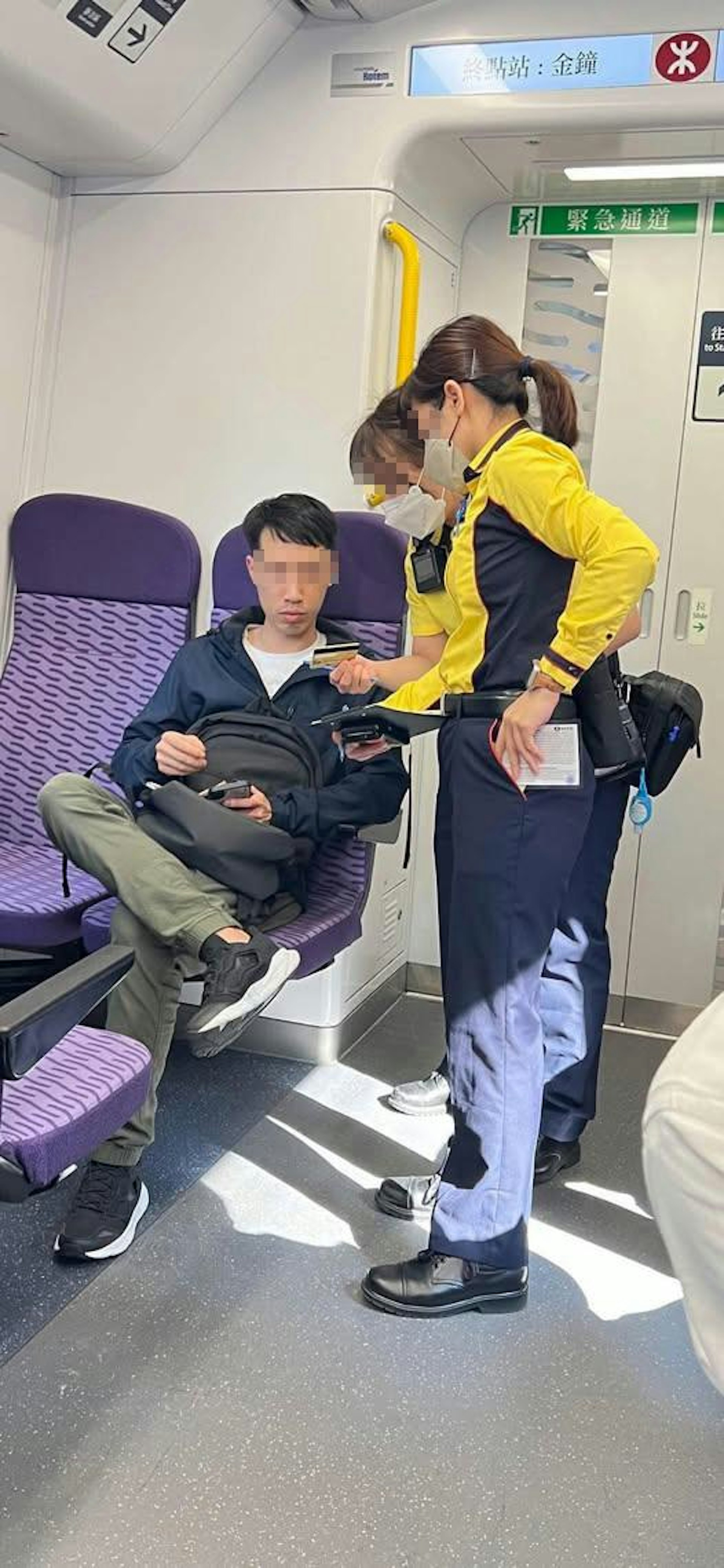 本港網絡多個群組近日流傳1張相片,指往金鐘方向港鐵東鐵線頭等車廂內,有1名男乘客因沒有支付車資,被2名港鐵女職員即場罰款1,000元。