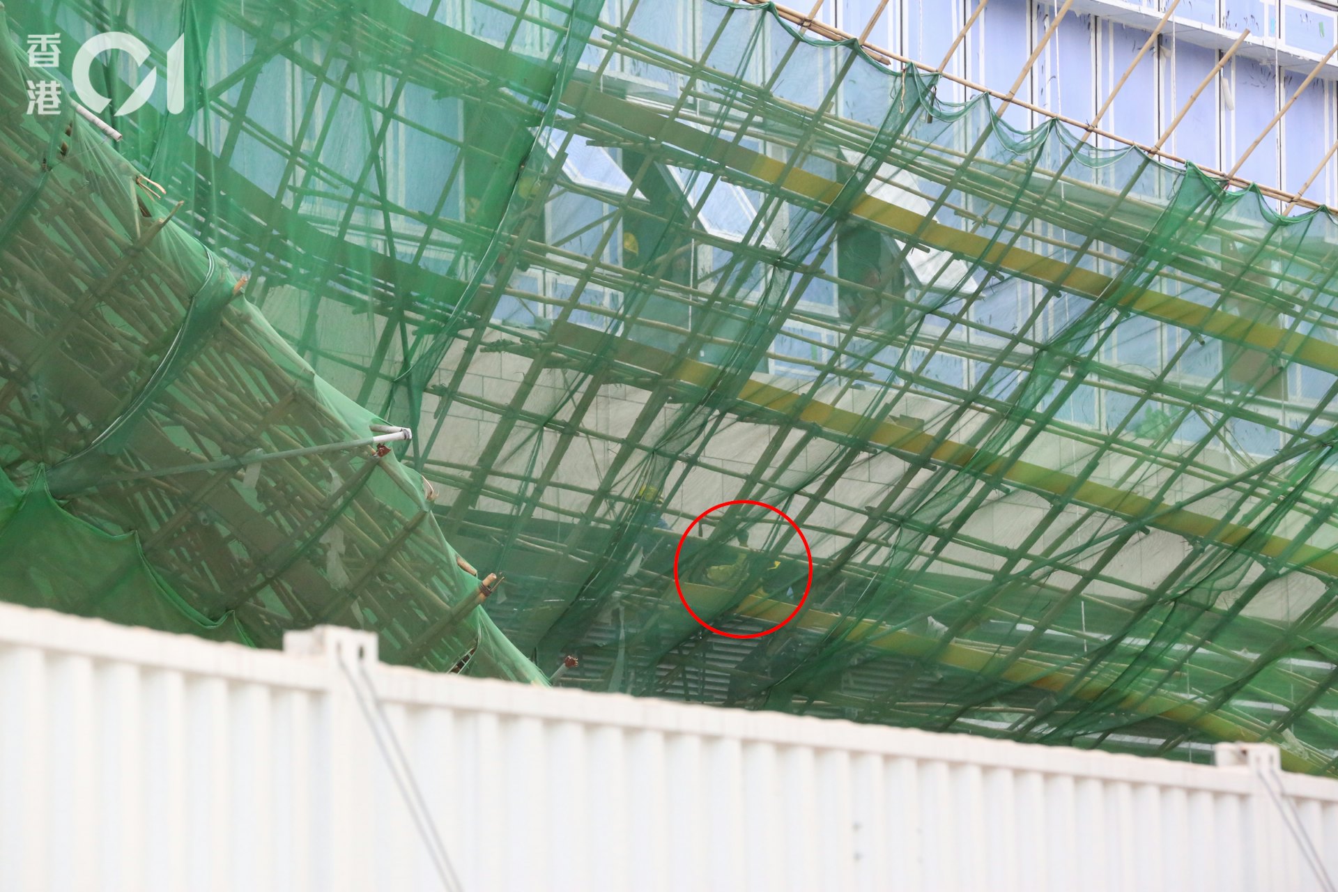 意外後,一名有繫安全繩的女工人被夾於多條棚竹之間,原本所戴粉紅色頭盔亦甩脫。(讀者提供圖片)