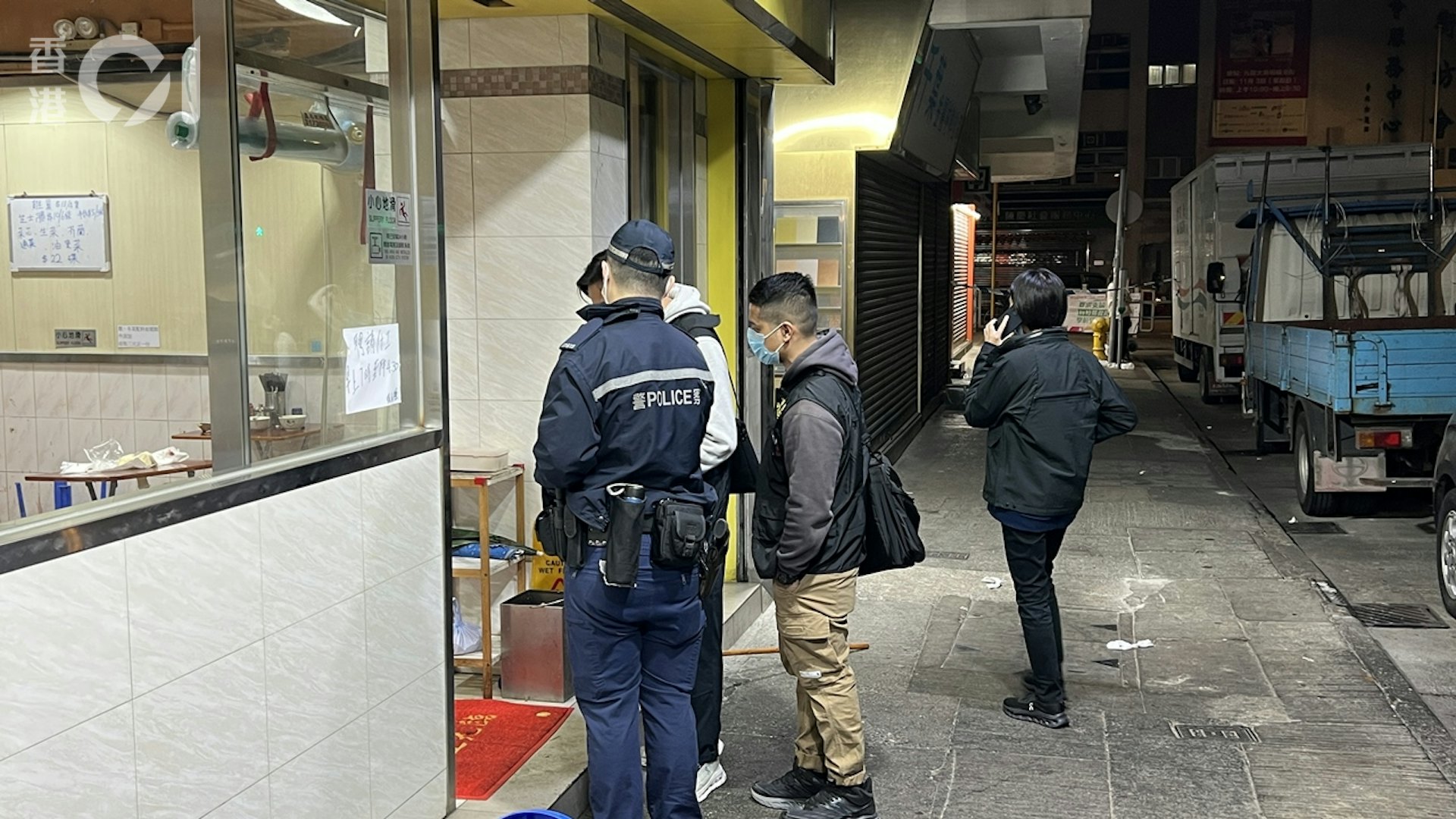 7 D% x# x6 p6 [5 B5 I: l案發現場為大角咀英記油渣麵。事發後店內相當凌亂,血花四濺。店內設有閉路電視,警員正調查事發組過。(李家傑攝)